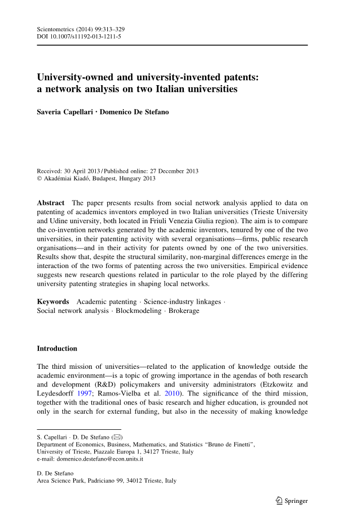 本文旨在分析学术专利行为的两种形式(高校拥有的和高校发明的专利)所涉及的学术发明人构成的共同发明网络,将这两种类型的信息保持在所有权层面(受让人)和个人层面(发明人)。我们收集了两所意大利大学——的里雅斯特大学(Trieste University)和乌迪内大学(Udine University)的专利数据,这两所大学都位于意大利中等规模的弗留利威尼斯朱利亚区(Friuli Venezia Giulia,有140万人口),属于意大利最优秀的五个创新地区之一。