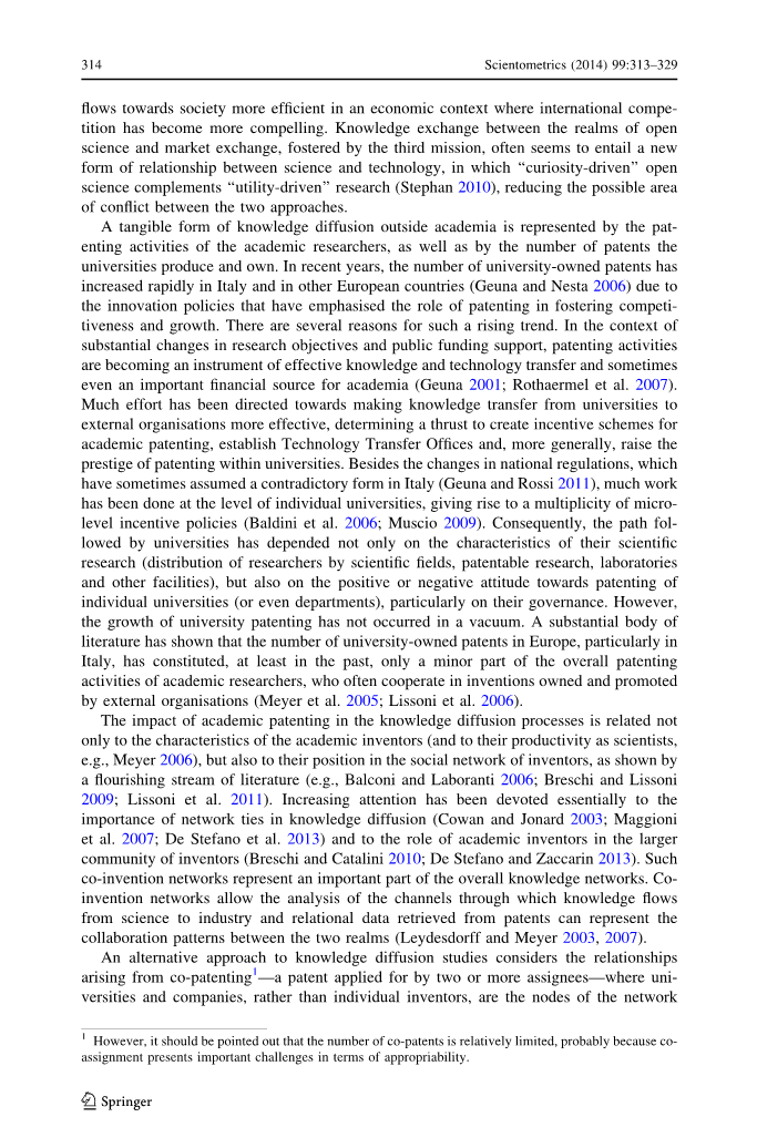 学术专利在知识传播过程中的影响不仅仅和学术发明家的特点有关(例如他们作为科学家的生产力,迈耶2006),也和他们发明家社交网络的位置,正如诸多文献所展示的一样(如Balconi和Laboranti 2006;Breschi和Lissoni 2009;Lissoni等. 2011)。越来越多的注意力主要集中在网络关系在知识传播中的重要性上(Cowan and Jonard 2003;Maggioni等. 2007;许多关注同样放到了学术发明家在更大的发明家群体中的作用(Breschi和Catalini 2010;De Stefano和Zaccarin 2013)。这种共同发明网络是整个知识网络的重要组成部分。共同发明网络允许对知识从科学流向工业的渠道进行分析,从专利中检索的关系数据可以表示两个领域之间的协作模式(Leydesdorff 和 Meyer 2003, 2007)。