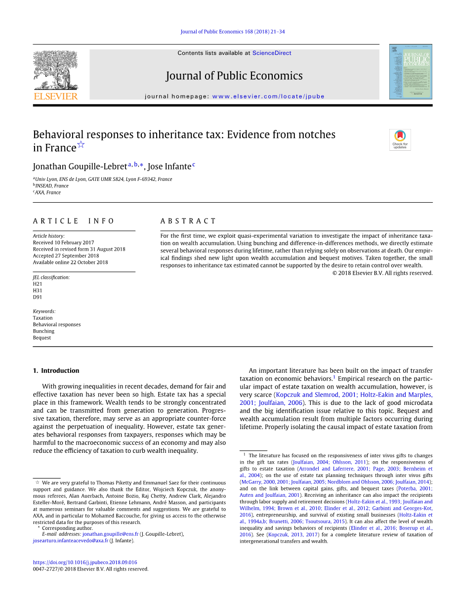Key words: Taxation;Behavioral responses;Bunching;Bequest