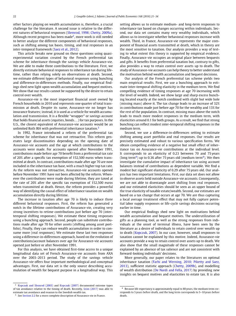 实证研究结果为财富积累和遗赠动机提供了新的解释。生前赠与作为计划工具的不完全利用,以及人们在晚期疾病发现之初的强烈反应,可以视为个人持续控制财富直至死亡的愿望。然而在我们的案例中,这种动机并不能解释对税收的微弱反应。的确,Assurance-vie账户提供了一种持续控制财富直至死亡的方式。我们同样发现,这些行为反应的微弱程度不能被缺少税收凸显解释,也不符合远见个体的决策。