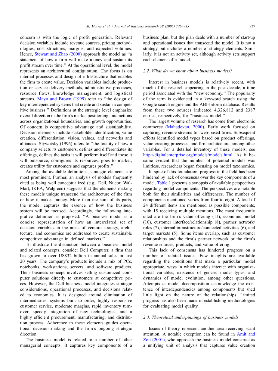最大的研究来自电子商务(Mahadevan,2000)。早期的工作侧重于为网络公司捕捉收入来源。随后的工作基于产品供应,价值创造过程和坚实的体系结构等确定了模型类型。有关这些模型的详细清单,请参阅http://digitalenterprise.org/models/models.html。显然,潜在模型的数量是无限的,研究人员开始关注模型分类。尽管有这样的基础,但由于缺乏对模型关键组成部分的共识,阻碍了该领域的进展。表1提供了关于模型组件的可用观点的概要。这些观点都是值得注意的,因为它们的相似性和差异性。提到的组件数量从四个到八个不等。共有24个不同的项目被提及作为可能的组成部分,15个接受多个提及。(11),经济模型(10),客户界面/关系(8),合作伙伴网络/角色(7),内部基础设施/关联活动(6)和目标市场(5) 。有些项目重叠,如客户关系和公司的合作伙伴网络或公司的收入来源,产品和价值提供。
