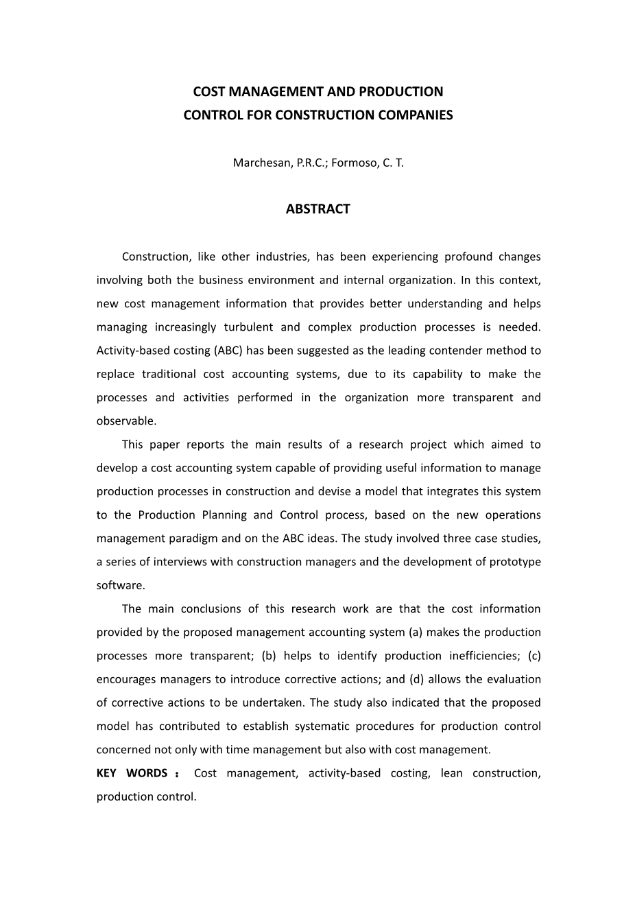 本论文报告了一个研究课题的主要结果,该课题的目的是发明一种成本计算系统,该成本计算系统要能够为管理建设中的生产过程提供有用的信息,以及设计一个把该系统合并到以新型的操作管理以及作业成本计算为基础的生产规划和控制过程中。该研究涉及到三个案例研究和一些对建筑管理者的采访和模型软件的开发。