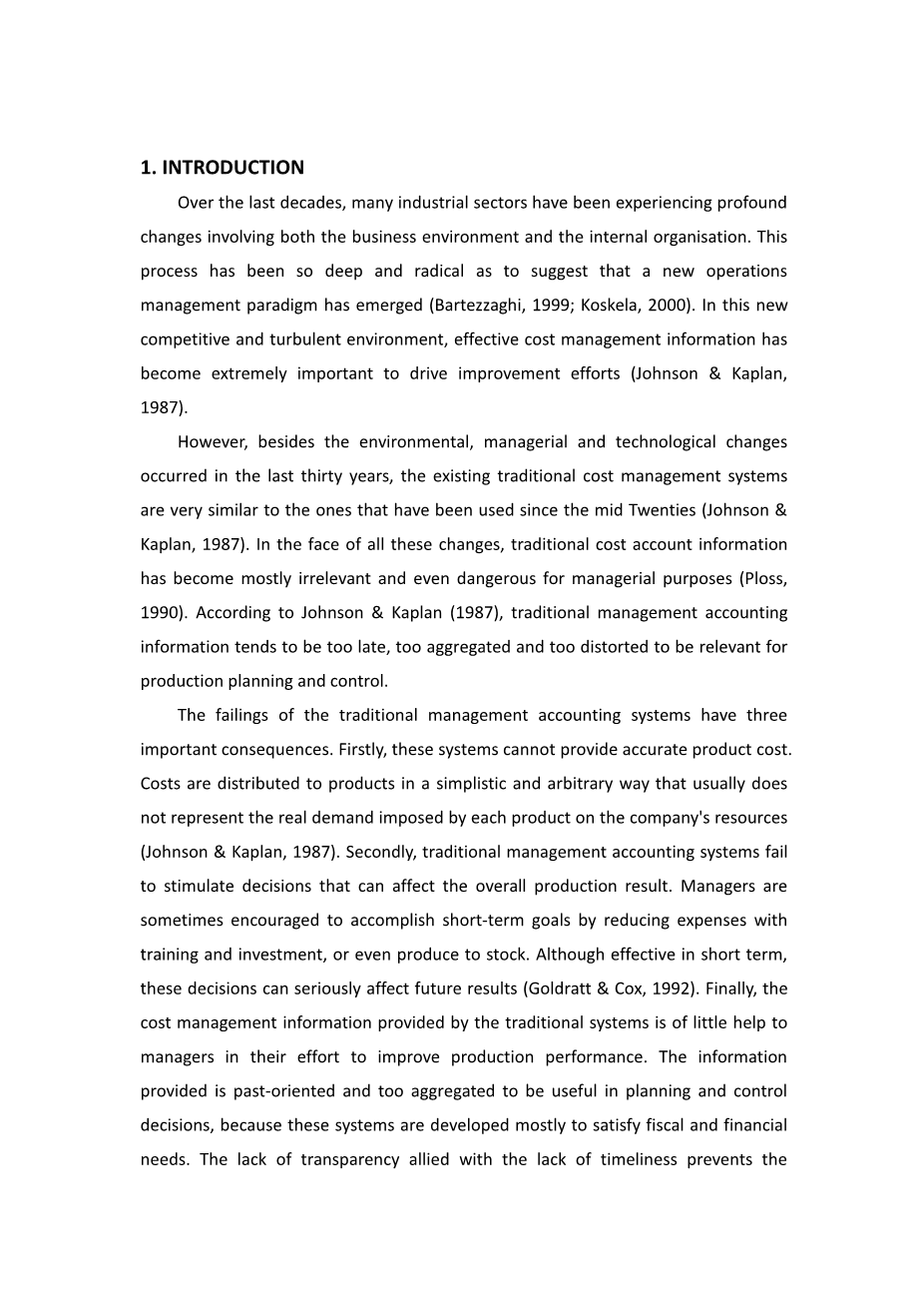 在过去的几十年间,许多行业在商业环境和内部结构上已经经历的意义深远的变革。这种变革的过程是如此的深邃和剧烈从而引入了新型的操作管理规范(Bartezzaghi, 1999; Koskela, 2000).在这种新型的竞争与动荡的环境下,高效的成本管理信息已经变得极其重要,从而可以推动改进成果。(Johnson amp; Kaplan, 1987).