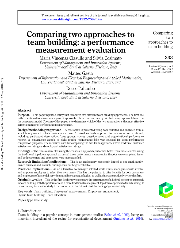 目的——本文报告了一项比较两种不同的团队建设方法的研究。第一种是传统自上而下的管理方法。第二种是基于共识模型的混合底层方法。本文的目的是确定这两种方法中哪一种是最有效的绩效衡量手段。