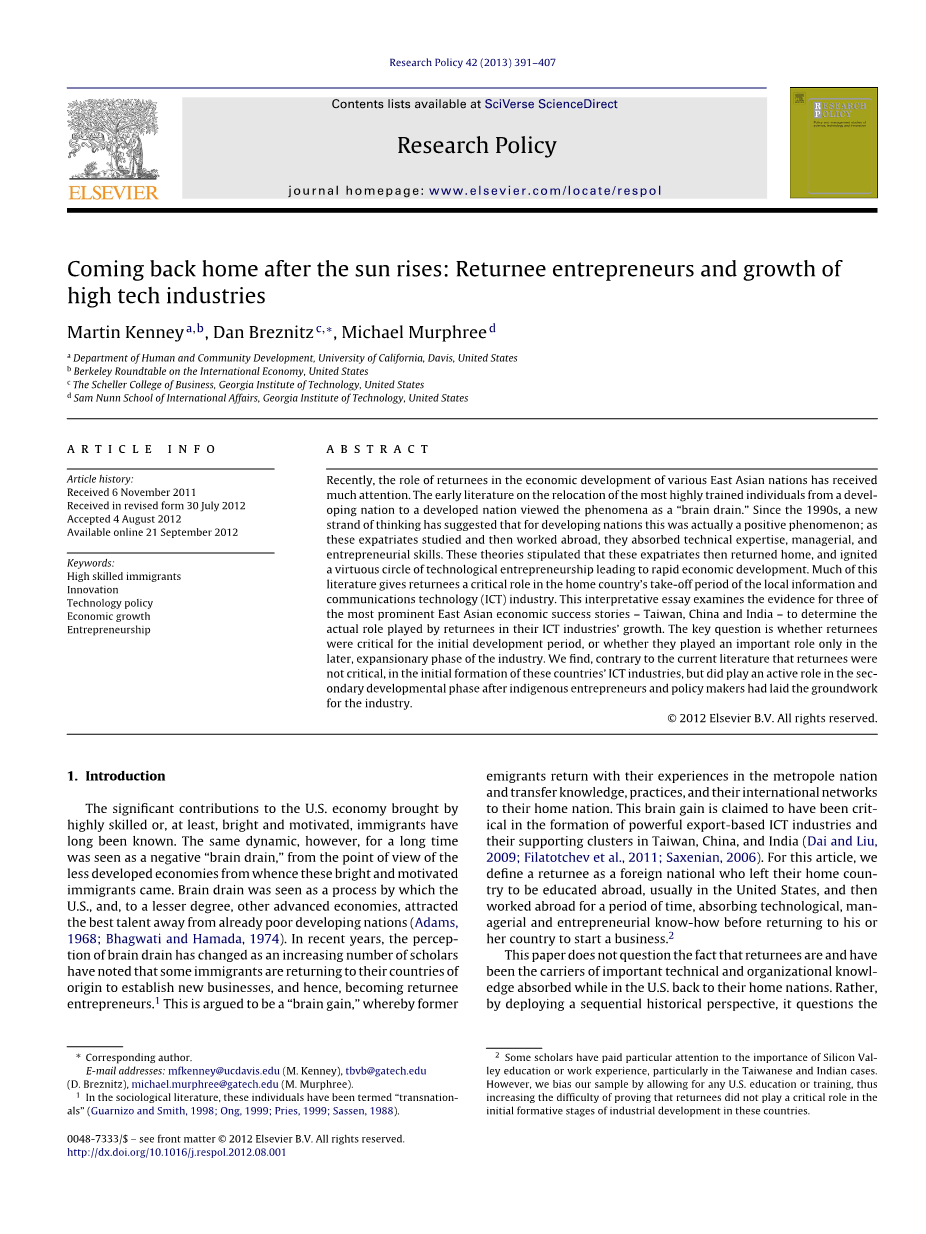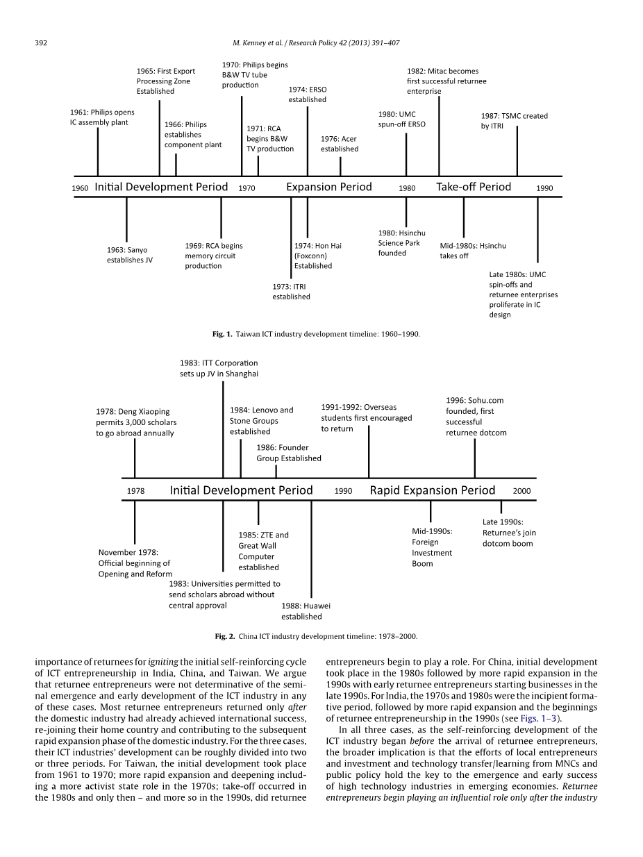 了解海归人员的作用不仅在理论发展和我们对基于快速创新的经济增长的理解方面具有学术意义,而且具有重大意义,因为越来越多的国家正在制定政策鼓励海外工程师和科学家(Kuznetsov,2006; Meyer,2001; Meyer和Wattiaux,2006)。例如,中国的中央和地方政府都在执行旨在引诱回归者(当地称为海龟)的昂贵计划,希望他们能够带来大规模的企业家成长浪潮,并将当地的动力转化为更高的增长曲线(Breznitz和Murphree,2011; Fuller,2005,2010)。库兹涅佐夫(2006)指出,墨西哥,阿美尼亚和南非政府也在积极寻求利用外来移民和移民网络作为国内工业来源的手段,试用开发资金和专业知识。一些政府开始相信回归者是Sil-icon Valley电子集群形成的关键(Breshahan and Gambardella,2004)。本文采用明确的历史分析,评估了返乡创业者在台湾,中国和印度形成早期企业和关键政策措施的作用。