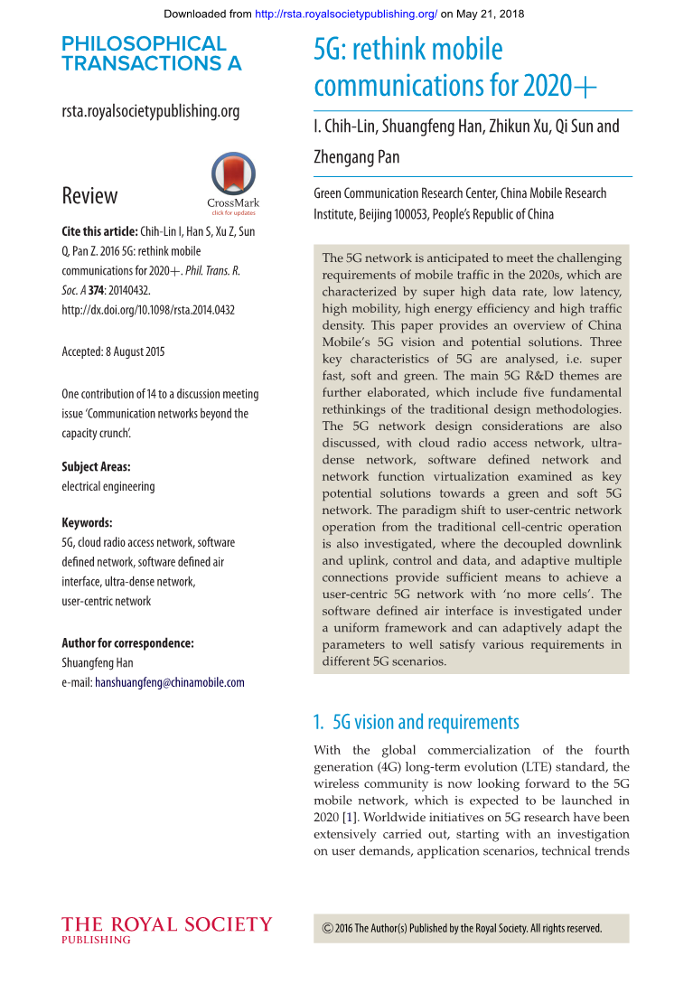 摘要:预计5G网络将在20世纪20年代满足移动业务的挑战性要求,其特点是超高数据速率,低延迟,高移动性,高能效和高流量密度。本文概述了中国移动的5G愿景和潜在解决方案。分析了5G的三个关键特性,即超快速,软和绿色。主要的5G研发主题进一步阐述,其中包括对传统设计方法的五个基本思考。我们还讨论了5G网络设计方面的考虑因素,包括云无线接入网络,超密集网络,软件定义网络和网络功能虚拟化,这些都是绿色软5G网络的关键潜在解决方案。还研究了从传统的以小区为中心的操作到以用户为中心的网络操作的范式转换,其中的下行链路和上行链路,控制和数据以及自适应多连接提供了足够的手段来实现以“不再更多”为目标的以用户为中心的5G网络细胞#39;。软件定义的空中接口是在一个统一的框架下进行调查的,可以自适应地调整参数,以很好地满足不同5G场景下的各种需求。