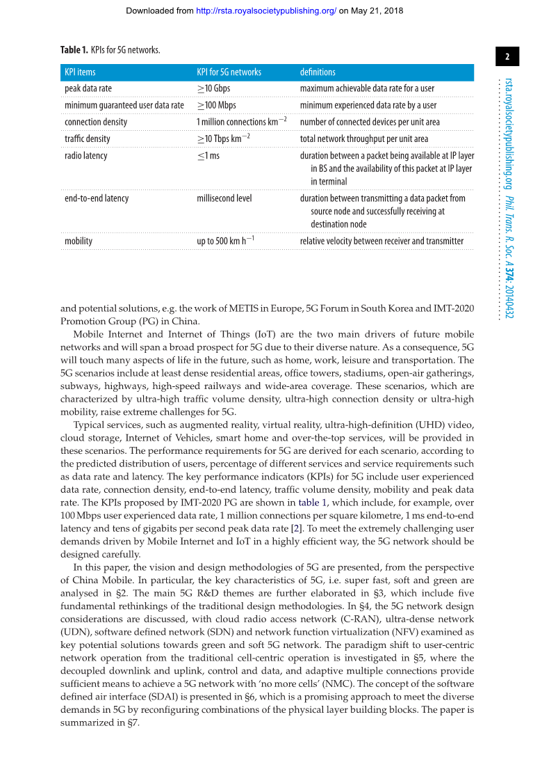 这些场景将提供典型的服务,如增强现实,虚拟现实,超高清(UHD)视频,云存储,车辆互联网,智能家居和过度服务等。 根据用户的预测分布,不同服务的百分比和服务要求(如数据速率和延迟),可以为每种情况推导出5G的性能要求。 5G的关键性能指标(KPI)包括用户体验数据速率,连接密度,端到端延迟,流量密度,移动性和峰值数据速率。 IMT-2020 PG提出的关键性能指标如表1所示,其中包括例如超过100 Mbps的用户体验数据速率,每平方公里100万个连接,1 ms端到端延迟和每秒数十兆比特峰值数据速率。 为了以高效的方式满足移动互联网和物联网所带来的极具挑战性的用户需求,5G网络应该被精心设计。