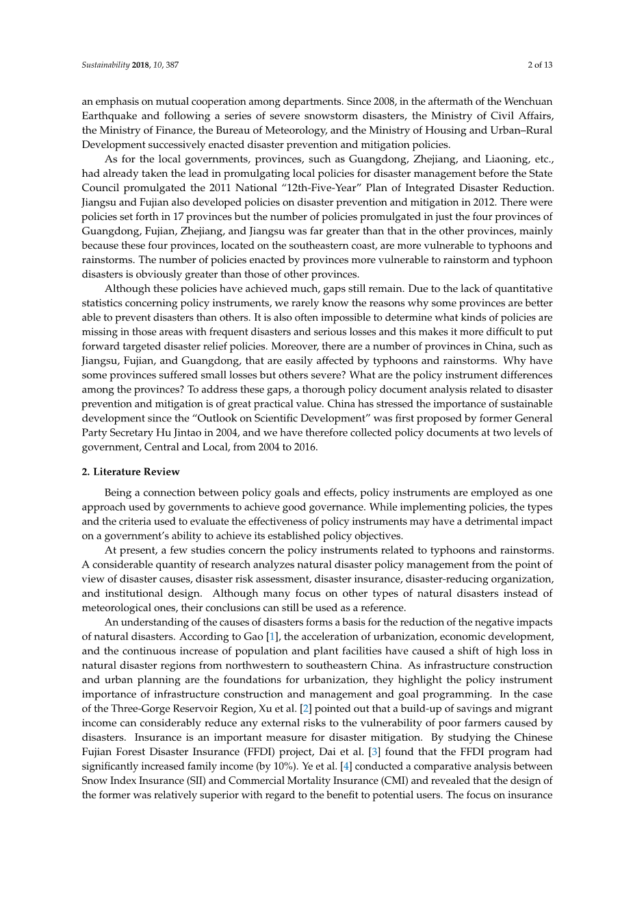 虽然这些政策取得了很大成绩,但仍然存在差距。由于缺乏量化有关政策工具的统计数据,我们很少知道一些省份能够更好防止比其他人遭受更多的灾难的原因。在那些频繁发生灾难和严重损失的地区决定什么样的政策通常也是不可能,这使得更加困难投入和推进有针对性的救灾政策。而且,中国有一些省份,比如江苏,福建和广东,这些地区容易受台风和暴雨影响。为什么有有些省份遭受的损失很小,但其他省份却严重?各省之间政策工具的差异是什么?为了弥补这些差距,对灾难的政策文件进行彻底分析对灾害的预防和缓解具有重大的实用价值。从2004年前任党委书记胡锦涛提出 “科学发展观”以来,中国强调了可持续发展的重要性,因此我们收集了从2004年到2016年中央和地方政府两个级别的政策文件。