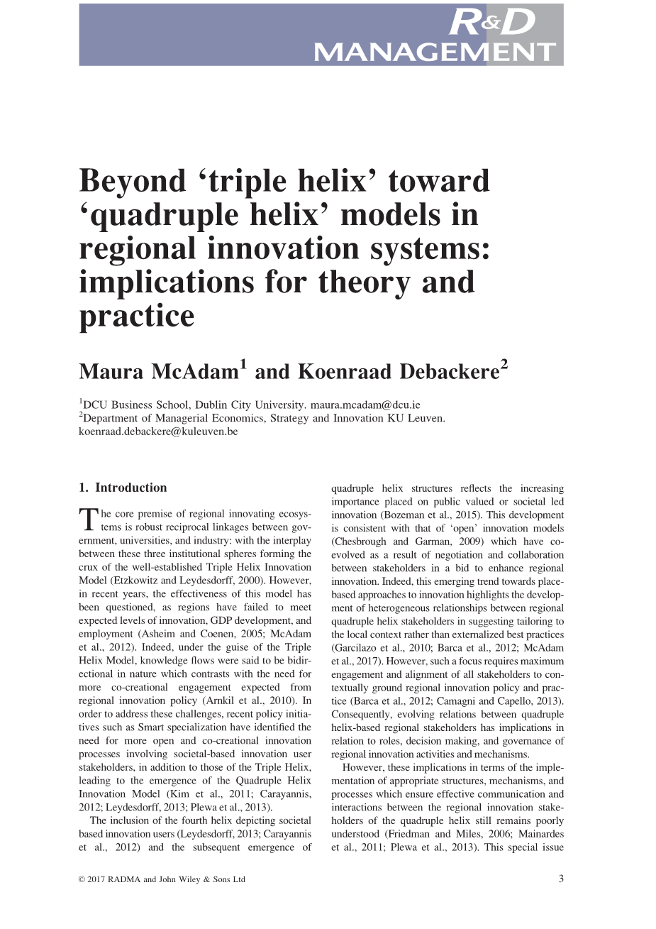 然而,就实施适当的结构,机制和流程而言,这些影响确保了四重螺旋的区域创新利益相关者之间的有效沟通和相互作用仍然知之甚少(Friedman and Miles,2006; Mainardes等人,2011; Plewa等,2013)。这个特刊旨在通过介绍探索发展的论文来解决这种理解上的差距(Barbosa and Faria,2011; Asheim et al。,2011; Zahra and Wright,2011)的四重螺旋创新模型。本期特刊中的论文承认最终用户/客户在区域创新系统中的新角色以及由此产生的关系动态;除了评估四重螺旋创新模式中区域利益相关方合作机制的有效性之外。为了辅助这些探索,我们采用了一系列与四联螺旋方法相适应的研究方法,包括横向研究,纵向研究,混合方法和系统文献综述方法。在这样做的时候,我们有信心通过提出有趣和新颖的问题而包含的论文提出有关四联螺旋创新模型的辩论和理论。本特刊中的论文分类如下: