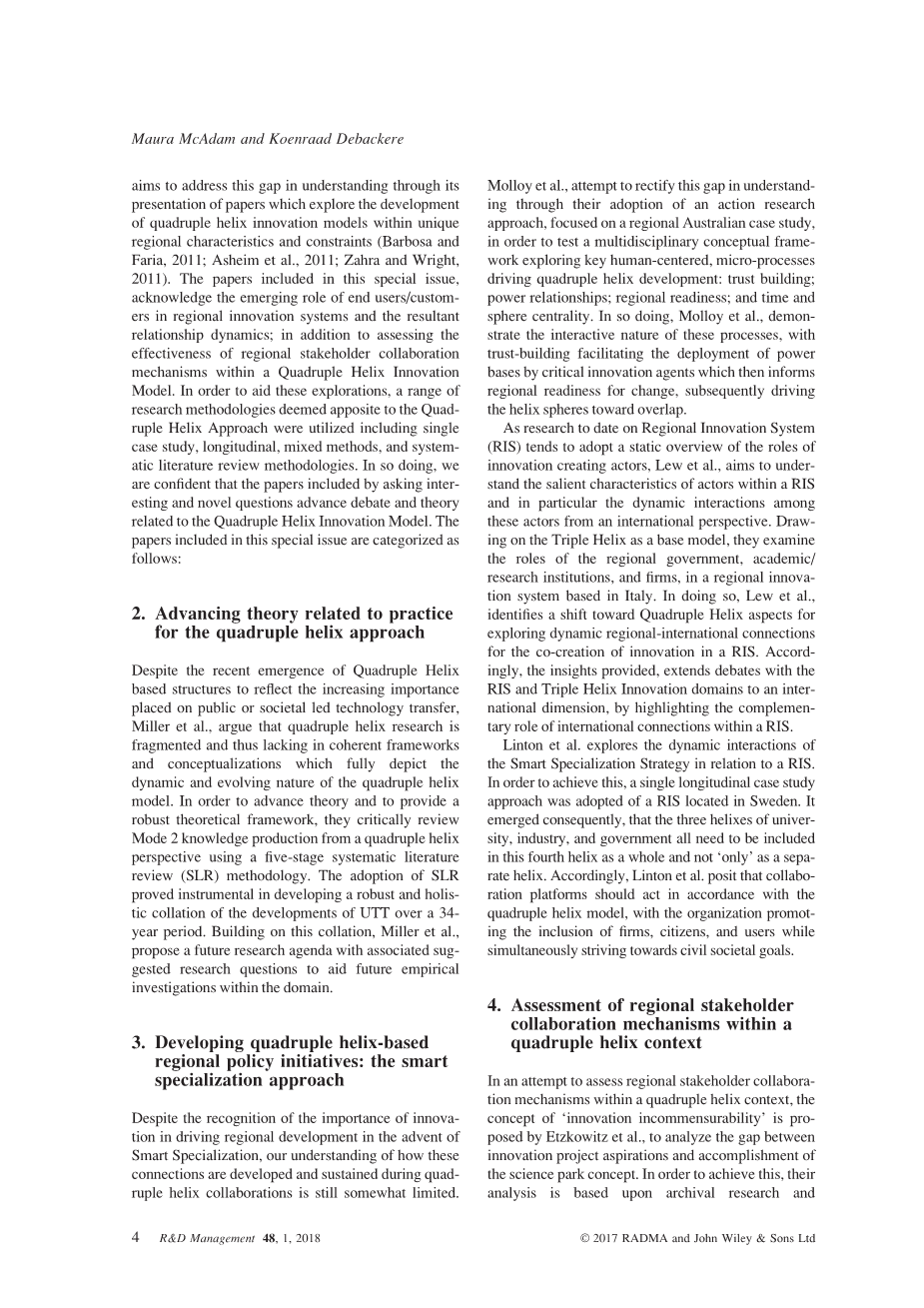 尽管我们认识到创新在推动智能专业化进程中推动区域发展的重要性,但我们对这些方式的理解在四重螺旋合作过程中,连接的发展和持续性仍然有限.Molloy等人试图通过采用行动研究方法纠正这种理解上的差距,重点是澳大利亚的区域性案例研究,以测试多学科概念 框架探索推动四重螺旋发展的关键的以人为本的微观过程:信任建立;权力关系;区域准备情况; 时间和球体的中心性。通过这样做,莫洛伊等人证明了这些过程的互动性,建立信任促进了关键创新代理人部署权力基础,然后通过区域变革准备就绪,随后将螺旋领域推向重叠。