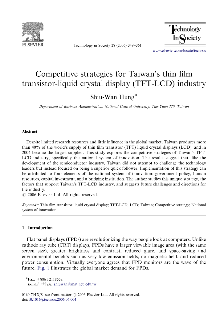面对如此的成功,在平面显示面板技术方面,台湾缺少根深蒂固的技术和科学基础。在基础物理或电子技术方面少有研究,台湾在材料科学和精准制造仪器方面缺少足够的容量。自从上世纪九十年代初,日本和美国在这方面已经投入了重资。另外,台湾在定义产品规格方面的角色由于国内市场和国民经济是受到限制的。尽管有这些劣势,台湾依然建立起了十分成功的TFT-LCD产业。它的成功最主要的原因在于竞争战略,那就是它在全球竞争格局中找到了一个生态位位置。本文研究了台湾TFT-LCD产业的竞争战略。指出了核心能力与支持性要素,讨论了台湾TFT-LCD产业未来的挑战和方向。