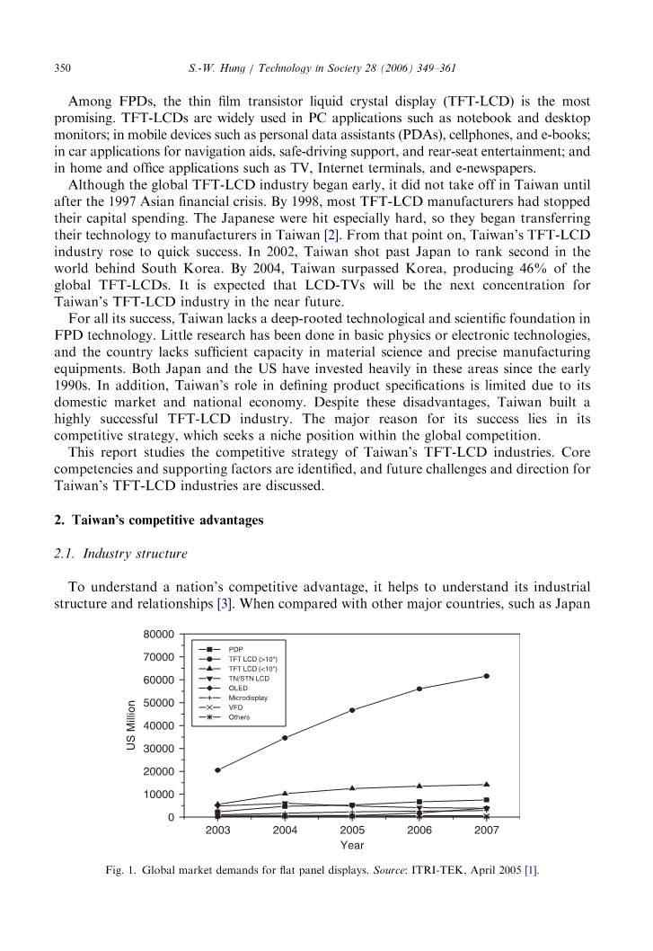 长期以来,日本由于其早期的平面显示器技术的研发工作及强大的市场支撑,在TFT-LCD市场上是定制规格的位置。然而韩国在政府的支持下,韩国赶上了日本成为世界上最大的TFT-LCD制造商。就其本身而言,尽管努力赶上先进的显示技术,但是台湾的研究和发展均不足,并且缺乏经验。国内市场固有的局限性进一步阻碍了台湾定义产品规格的能力。台湾可以做的最大努力就是积极参与,快速达到那些产品规格。和日本韩国的制造商相比,台湾TFT-LCD产业的制造商显得更弱,他们在国内TFT-LCD行业的成功是依靠于一个高度关联的产业结构。