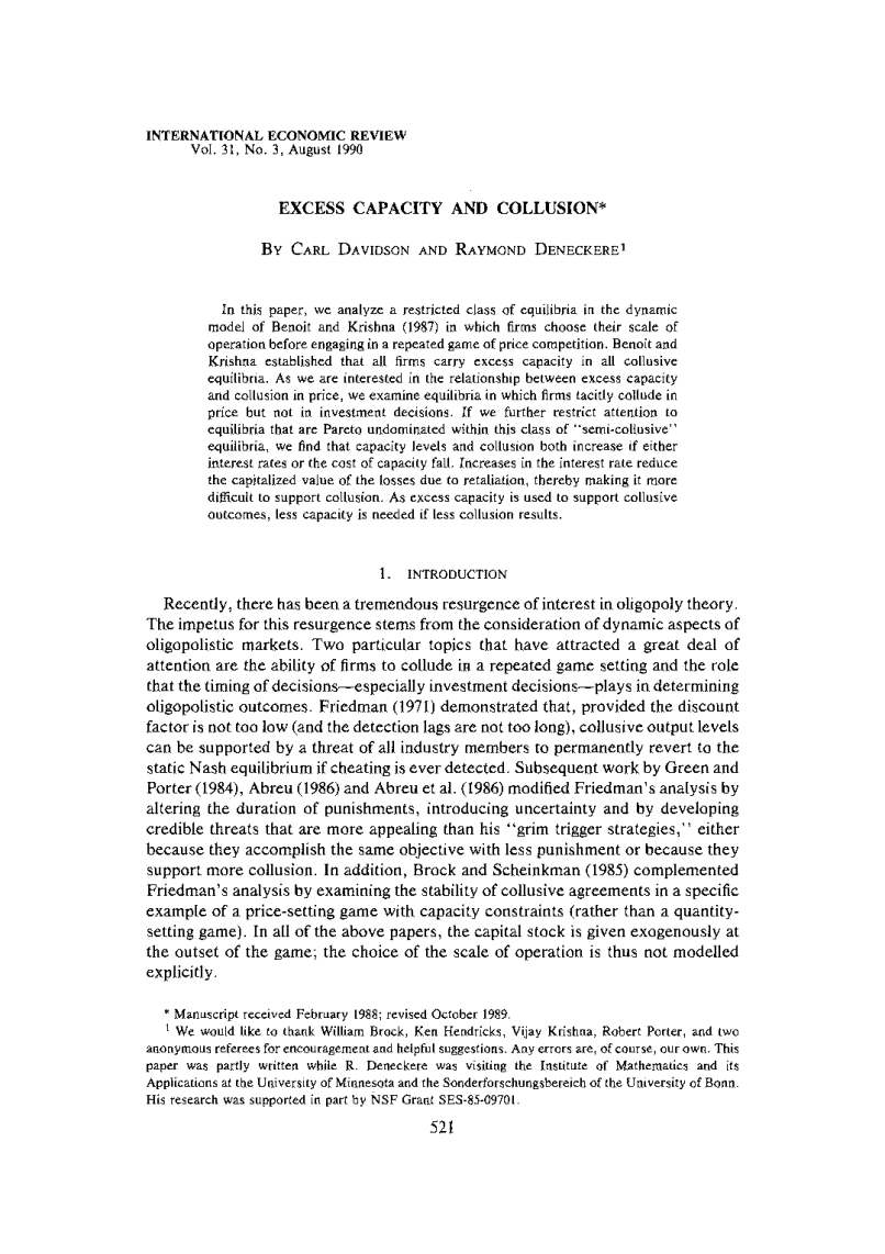 1. 我们要感谢William Brock,Ke [! Her1dricks,Vijay Krishr1a,Robert Porter,分别为鼓励者提供了两个有用的建议。 当然,Ar1y错误是我们自己的错误。 本文的部分内容是R. Deneckere访问明尼苏达大学数学及其应用学院和波恩Umversity大学的Sonderforschungsbereich。 他的研究部分由NSF Grant SESbull;85-0970l支持