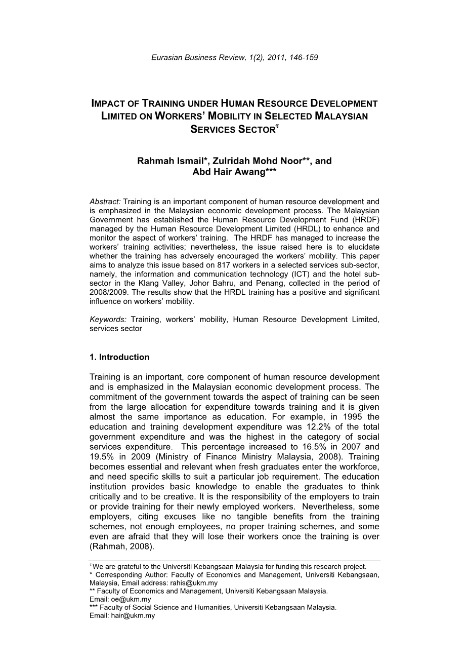 人力资源开发限制下的培训对选定马来西亚服务业工人流动性的影响外文翻译资料