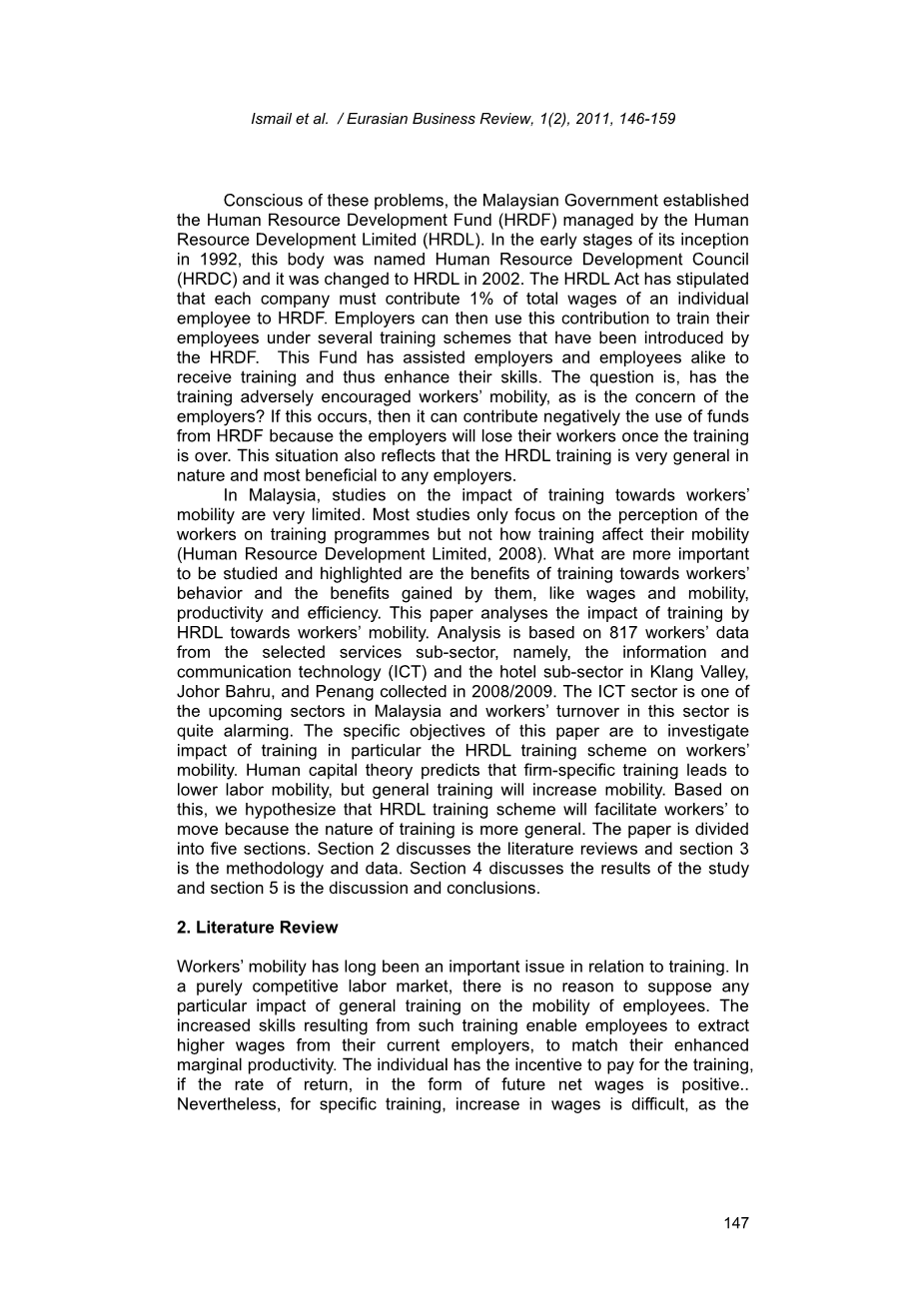 培训计划的工作人员,而不是培训如何影响其流动性(人力资源开发有限公司,2008年)。更重要的是什么要研究和突出强调的是培训工人的好处,行为和他们获得的好处,如工资和流动性,生产力和效率。本文分析了培训的影响HRDL对工人的流动性。分析基于817名工人数据从选定的服务分部门,即信息和通信技术(ICT)和巴生谷酒店分部门,柔佛州新山和槟城于2008/2009年收集。 ICT行业是其中之一即将到来的马来西亚行业和该行业的工人流动率是相当惊人。本文的具体目标是调查培训的影响,特别是HRDL培训计划对工人的影响,移动性。人力资本理论预测,公司特定的培训导致劳动力流动性较低,但一般培训会增加流动性。基于这个,我们假设HRDL培训计划将有助于工人去因为培训的性质更一般化。论文分歧分成五个部分。第2节讨论文献综述和第3节是方法和数据。第4节讨论研究结果