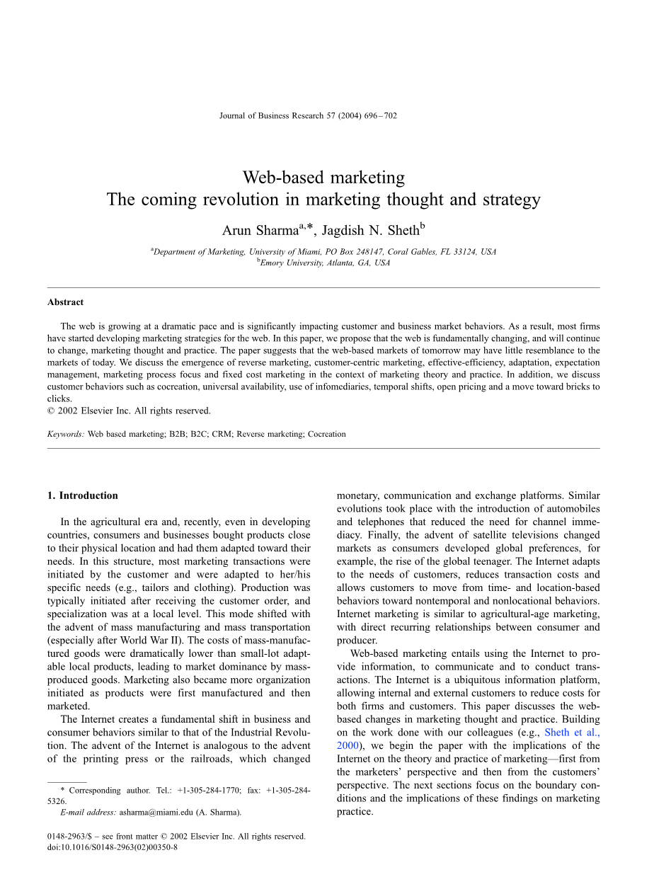 网络正在以一种戏剧性的速度成长,并显著影响着顾客和市场的行为。事实上,很多公司开始在网络上开展市场营销战略。在本文中,我们发现网络正在发生根本上的变化,并且这种变化将持续下去,不停的影响着市场战略和实践。我们认为,未来的网络市场与现有的网络市场将有天壤之别。我们探讨反向营销的产生,以顾客为中心的市场营销的出现,效率、适应、期望管理、营销过程及重点、在市场理论和市场实践背景下的固定成本营销。此外,我们还探讨了一系列的顾客行为。