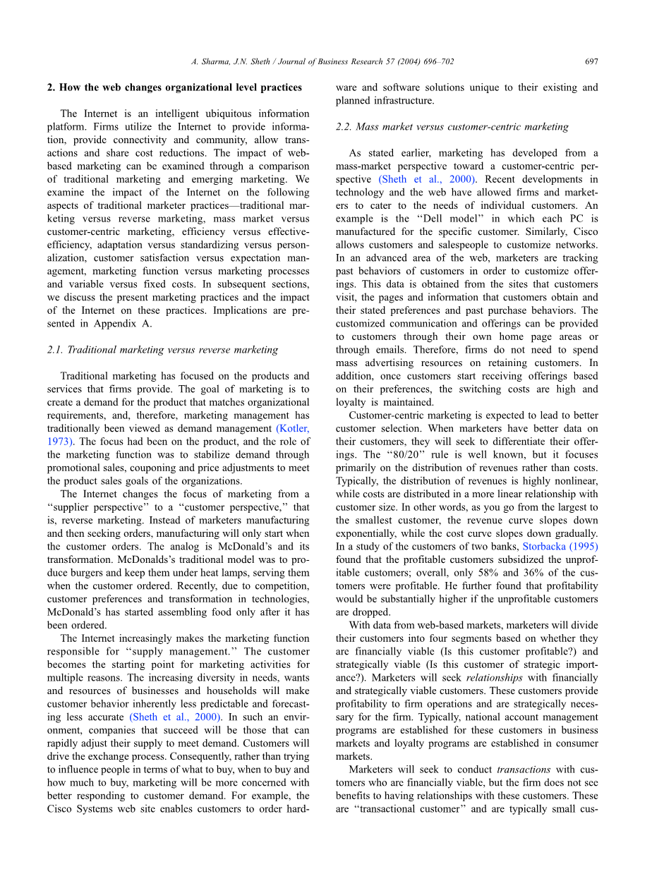 如前所述,市场营销已经从面向大众市场的观点转变为以客户为中心的角度(Sheth et al., 2000)近年来,技术和网络的发展允许公司和商人迎合个人用户的需要。 “戴尔模型”就是一个例子,戴尔的每台PC机是专为具体的客户而生产的。同样,思科允许客户和销售人员为客户量身定做网络产品。在一个先进地区的网络,销售人员正在跟踪客户过去行为以定制的产品。这个数据库包括客户访问过的网站,网页所包含的信息,客户的偏好和过去的购买行为。特制的沟通和产品能通过自己的主页区域或通过电子邮件提供给客户。因此,公司不需要花费大量告资源在保留顾客上。此外,一旦顾客开始收到根据他们的喜好定制的产品,交易的花费是昂贵的,客户的忠诚也得到良好的维持。