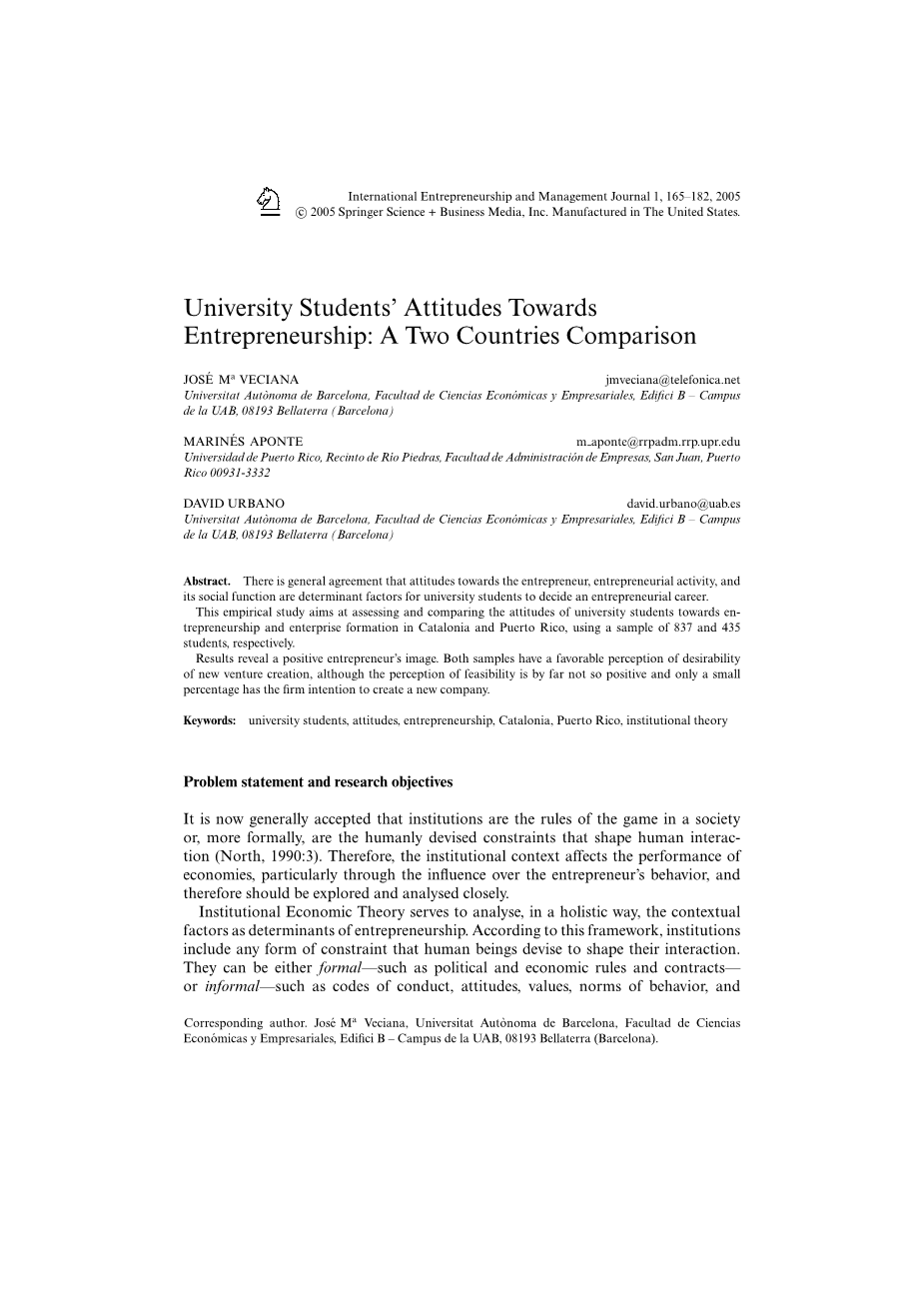 关键词:大学生 ,态度,企业家精神,加泰罗尼亚,波多黎各,制度理论