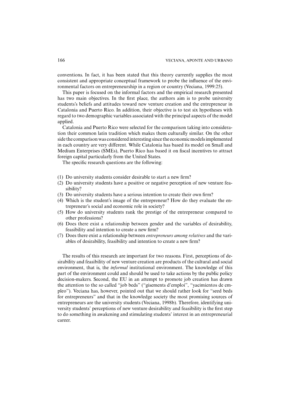这项研究的结果是重要的,原因有两个.首先, 对新企业创造的愿望和可行性的看法是文化和社会环境的产物即非正式的制度环境 。这部分的知识环境可以而且应该用于公共政策决策者采取行动.其次,欧盟为了促进创造就业机会吸引了关注所谓的“床”(“坐标偏角d #39;emploi”、“yacimientos de empleo”)。然而,Veciana指出,我们应该寻找“种子床为企业家”,在知识社会企业家的最有前途的来源是大学生(Veciana,1998 b)。因此,确定大学生对新企业愿望和可行性是第一步在觉醒和做一些刺激学生的兴趣创业生涯。
