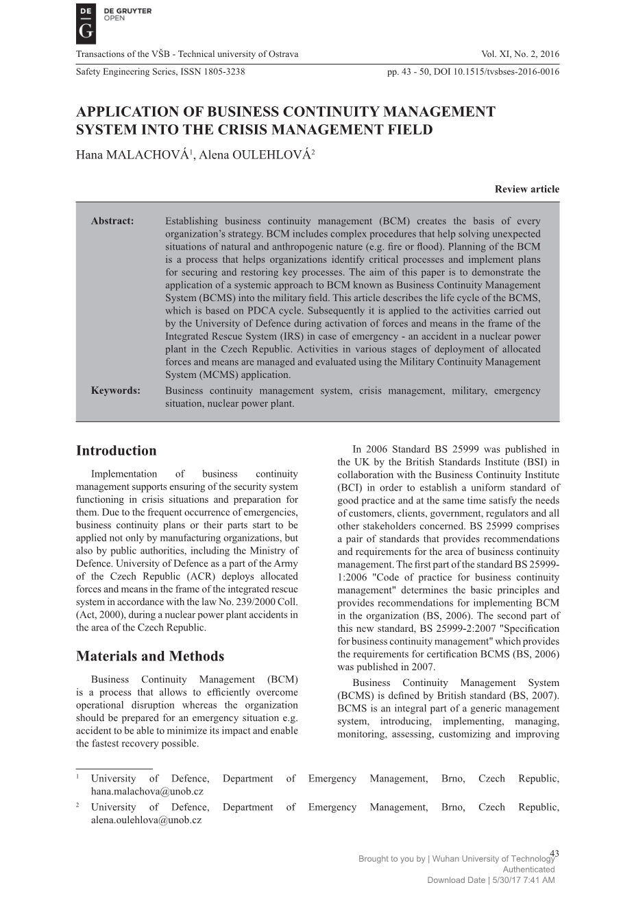 实施业务连续性管理支持确保安全系统在危机形势下的运行和准备。由于突发事件的频繁发生,业务连续性计划或其部分开始不仅适用于制造业组织,而且还包括公共部门,包括国防部。国防大学作为捷克共和军队(ACR)的一部分,在核电站发生事故时,在遵照239/2000号(2000年生效)法令救援体系的框架下分配救援力量和手段。