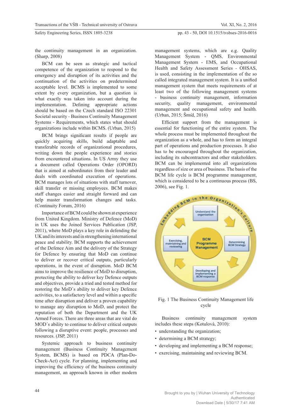 BCM可以被看作组织的战略和战术能力,以应对其活动的紧急情况和中断以及在预定的可接受水平上继续进行活动。BCMS在某种程度上可以由任何一个组织实施,但问题是在实施过程中考虑到了什么。定义适当的行动应基于捷克标准ISO 22301社会安全 - 业务连续性管理系统 - 要求,这其中规定组织应在BCMS中包含哪些内容。(Urban,2015)