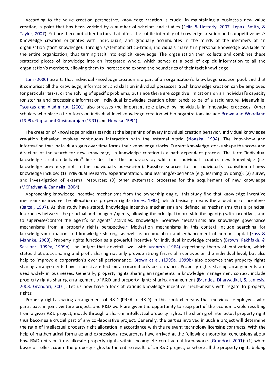 接近知识的激励机制从所有权角度,1本研究发现知识激励机制涉及产权分配(琼斯,1983),这基本上意味着分配的激励(巴泽尔,1997)。这项研究已经指出,知识激励机制被定义为一个主要设置了委托人和代理人/代理机构之间的,让委托人提供代理(S)与激励和监督/控制代理人的代理活动。知识激励机制是知识治理机制的一种机制产权视角。在这样的背景下,两大激励机制包括寻找知识、信息和知识的共享,以及积累和人力资本提升的源码。产权作为个人知识创新的强大动力,吻合弗鲁姆的期望(1964)激励的期望理论,即股份分享利润,不仅提供了在个人层面上强有力的财政刺激,也有助于提高公司在所有体育性能。棕色等。(1999a,1999b)也指出,产权共享安排对公司绩效有显著的正向影响。产权分享安排使用范围广在企业中。一般来说,产权在知识管理背景下共享安排包括产权共享安排研发和分享产权安排(布兰德斯,格兰多里,2003,2001)。现在让我们在不同的知识激励机制看关于产权: