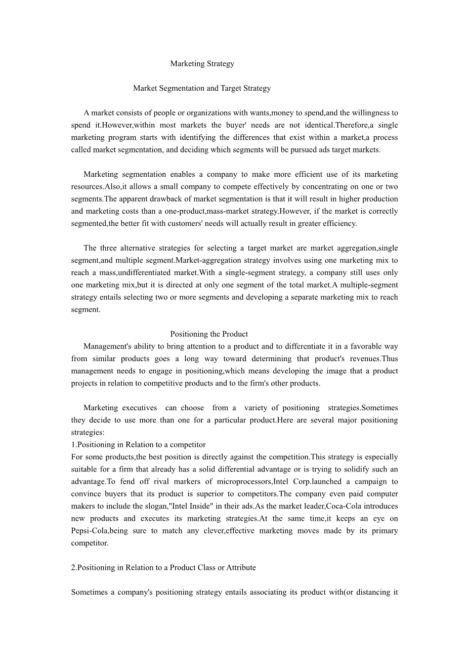 1 市场策略 具有需求,具有购买能力并愿意花销的个体或组织构成了市场。然而,在大多数市场中,购买者的需求不一致。因此,对整个市场采用单一的营销计划可能不会成功。一个合理的营销计划应以区分市场中存在的差异为起点,这一过程被称为市场细分,它还包括将何种细分市场作为目标市场。 市场细分使公司能更加有效地利用其营销资源。而且,也使得小公司可以通过集中在一两个细分上场上有效地参与竞争。市场细分的明显缺点是,其导致了比单一产品、单一大市场策略更高的生产和营销成本。但是,如果市场细分得当的话,更加符合消费者的需求,实际上将生产更高的效率。 确定目标市场有三种可供选择的策略,它们是统一市场、单一细分市场和多重细分市场。统一市场策略即采取一种营销组合用到一个整体的、无差异的市场中去。采取单一细分市场策略,公司仍然仅有一种营销组合,但它只用在整个市场的一个细分市场中。多重细分市场策略需要选择两个或更多的细分市场,并且每个细分市场分别采用一种单独的营销组合。