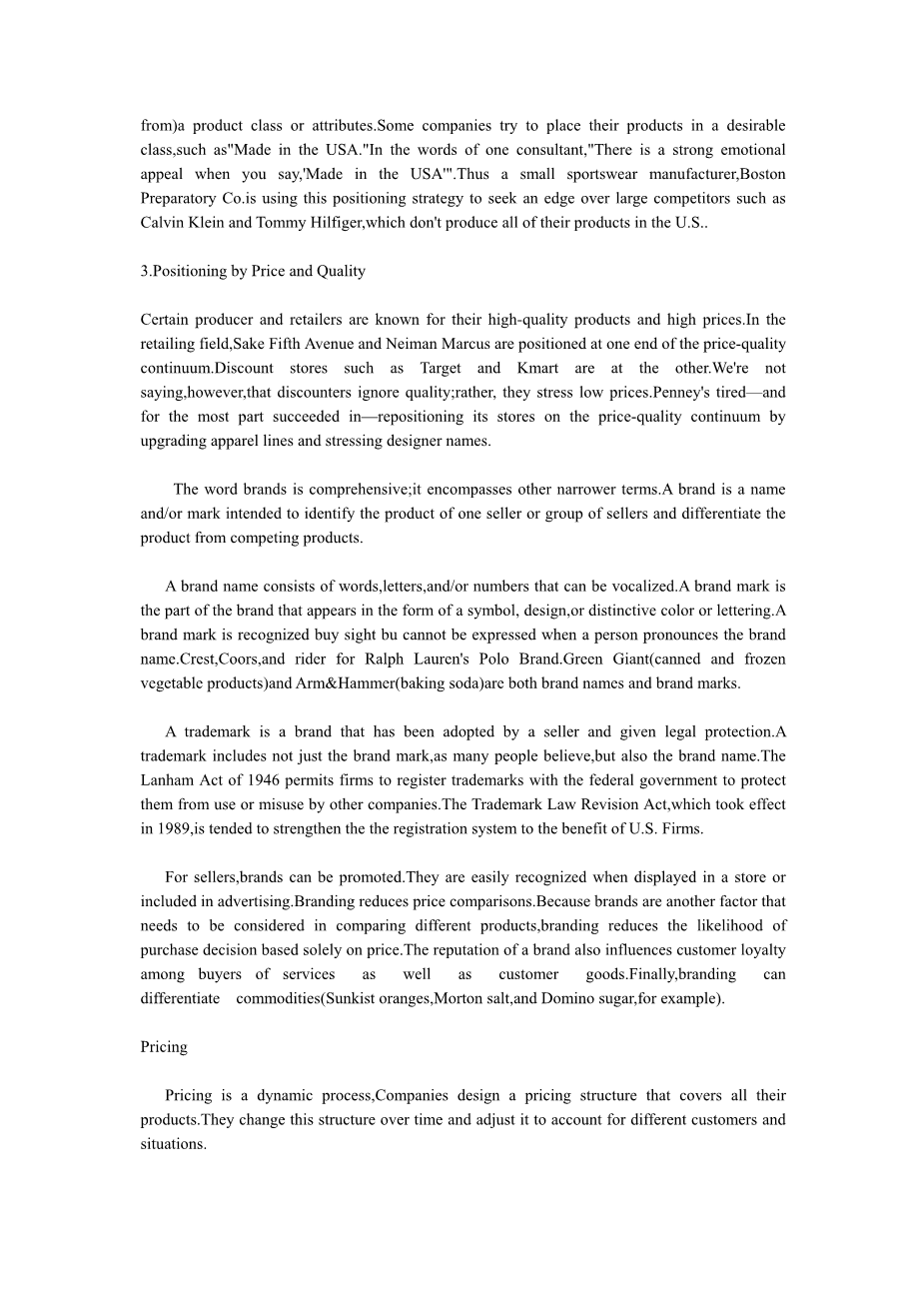 有时候,公司的定位策略有必要将自己的产品与其类别和属性相联系(或相区别)。一些公司尽力将其产品定位在期望的类别中,如“美国制造”。用一句某顾问的话来说,“当你说lsquo;美国制造rsquo;的时候,有一种强烈的感情因素在吸引着你”。因此,一家名为Boston Preparatory的规模不大的运动服造商正在运用这种定位策略,以期胜过那些并非所有产品都在美国制造的势力强大的竞争对手如Calvin Kiein和Tommy Hilfiger。 2.3 通过价格和质量定位 某些生产者和零售商因其高质量和高价格而闻名。在零售行业,Saks Fifth Avenue和Neiman Marcus公司正是定位于该价格—质量策略的。折扣店Target Kmart则是定位于该策略的反面。我们不是说折扣商店忽视质量,而是说它们更加强调低廉的价格。Penny#39;s公司努力—并且大多获得了成功—通过升级高级服装线和强调设计者的名字将其商店定位于价格—质量策略上。 “品牌”一词是个综合性的概念,它包含其他更狭义的理解。品牌即一个名称和(或)标志,用以识别一个销售者或销售集团的产品,并将之与竞争产品相区别。 品牌名称由能够发音的单词、字母和(或)数字组成。品牌标志是品牌的一部分,它以符号、图案或醒目的颜色、字体的形式出现。品牌标志通过视觉识别,但当人们仅仅读出品牌名称的时候,品牌标志并不能够被表达出来。Crest、Coors、Gillette都是品牌名称。ATamp;T由醒目的线条构成的地球以及Ralph Lauren#39;s Polo的马和骑手是品牌标志,而Green Giant(罐装冷冻菜蔬产品)和Armamp;Hammer(面包苏打)既是品牌名称又是品牌标志。 商标是销售者已经采用并且受到法律保护的品牌。商标不仅包括品牌标志,如许多人所认为的那样,也包括品牌名称。1946年的The Lanham Art法案允许厂商向联邦政府注册商标,以保护它们免受其他厂商的使用或误用。1989年生效的《商标法修订案》(The Trademark Law Revision Act)旨在健全注册系统以维护美国厂商的利益。 对于销售者来说,品牌可以被推广。当他们陈列于商店或出现在广告中时很容易被认出。品牌化减少了价格比较。因为在比较不同产品时,品牌是有必要考虑的另一因素,所以品牌化减少了仅仅依靠价格便作出购买决定的可能。品牌的知名度还会影响到购买服务和消费品的消费者的忠诚度。最后,品牌化可以区别商品(例如Sunkist牌鲜橙、 Morton牌食盐以及 Domino牌食糖)。 3 定价 定价是一个动态的过程,公司会为其所有产品设计一个定价结构。随着时间的推移,公司会改变价格结构,并将之调整到适应不同的消费者和形势的状态。 公司应采用多样的价格调整策略来适应消费群体和具体情况的差别。一个是折扣和折让定价,及公司依批量、功能或季节来决定折扣或不同形式的折让。第二个策略是差别定价,即公司为不同的顾客、产品或因地点不同而制定两个或两个以上的差别价格。有时公司在作价格决策时不仅考虑经济因素,而且使用心理定价来传达有关产品的质量或价值信息。在促销定价时,公司会在短期内以低于商品定价销售产品,通过大甩卖来吸引更多的顾客,有时甚至低于成本销售。运用价值定价,公司以公平价格提供相应的质量和优质服务。另一种方法是地区性定价,公司决定怎样为远距离的客户定价。通常有以下几种方法可供选择:原产地定价、统一交货定价、区域定价、基点定价和免收运费定价。