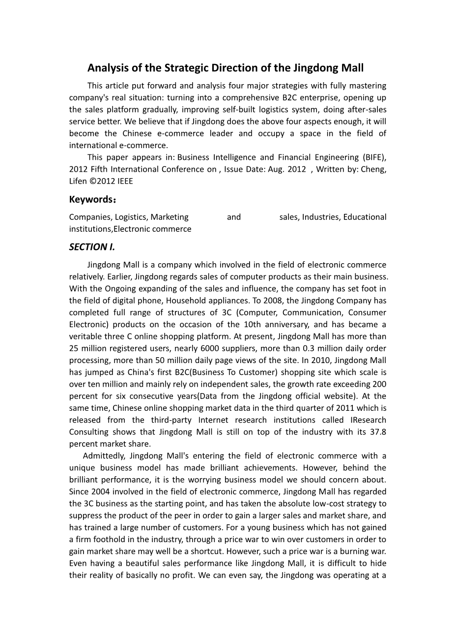 本文在充分掌握公司实际情况下提出并分析四大战略:变成一个综合性的B2C企业,逐步开放销售平台,完善自建物流体系,在做售后服务好。我们认为,如果京东做上述四个方面的话,它会成为中国电子商务领袖,占据国际电子商务领域的一席之地。