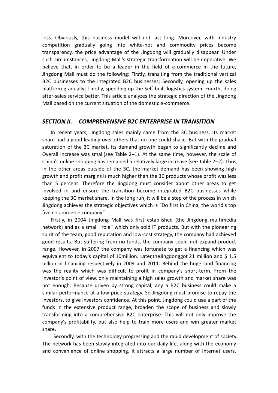 诚然,京东商城的进入电子商务领域由于其独特的商业模式取得了辉煌的成就。然而,在辉煌业绩的背后,是我们应该关注一下的令人担忧的商业模式。自2004年涉足电子商务领域,京东商城一直都把3C业务为出发点,并已采取了绝对的低价策略打压同行产品,以获得更大的销量和市场份额,培养了大批客户。对于一个年轻的公司,在行业内还没有站稳了脚跟,通过价格战来拉拢客户,以获得更多的市场份额很可能是一条捷径。然而,这样的价格战是一个燃烧的战争。甚至有一个漂亮的销售业绩像京东商城,也很难隐藏自己基本没有利润的现实。我们甚至可以说,京东是在亏本经营。显然,这种商业模式是不会长久的。而且,随着行业竞争逐渐进入白热化和大宗商品价格变得透明,京东的价格优势将逐渐消失。在这种情况下,京东商城的战略转型将是势在必行。我们认为,为了能在电子商务的未来领域的领军者,京东商城必须做到以下几点:首先,从传统的垂直B2C企业向综合B2C企业过渡;其次,逐步开放销售平台;第三,加快自建物流体系;四,做售后服务好。本文分析京东商城的战略方向是建立在国内电子商务的现状基础之上的。