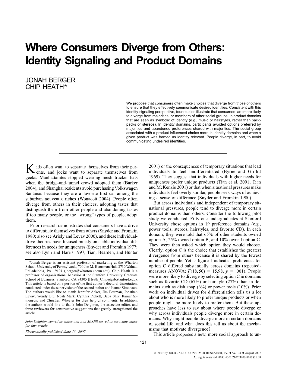 我们建议消费者经常做出与他人不同的选择,以确保他们有效地传达所期望的身份。与这种身份信号的观点相一致的是,四项研究表明,在被视为身份象征的产品领域,消费者更有可能与大多数人或其他社会群体的成员产生分歧。音乐或发型,而不是背包或音响)。在认同领域,参与者会避免多数人喜欢的选项,放弃与多数人共享的偏好。与产品相关的社会群体在身份领域对选择的影响更大,当一个给定的产品被框定为与身份相关时也是如此。人们产生分歧,部分原因是为了避免交流不受欢迎的身份。