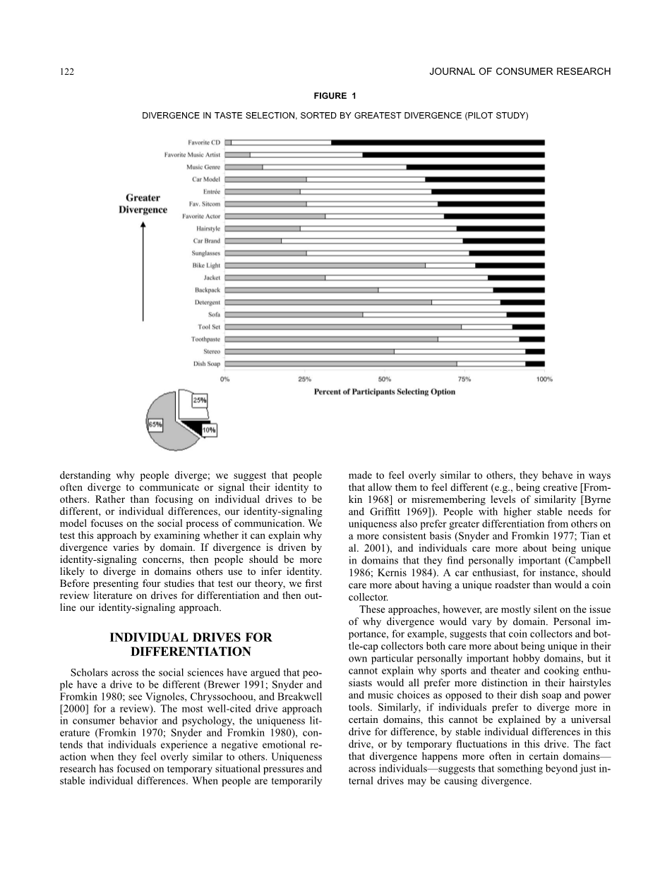 但在个体之间,且不受暂时的情境环境压力的影响,人们在某些产品领域往往比其他领域有更多的分歧。考虑以下我们进行的试点研究。斯坦福大学的51名本科生选择了19个偏好领域的选项。例如,电动工具,音响,发型,还有喜欢的CD)。在每个领域,他们被告知65%的其他学生拥有选项A, 25%拥有选项B, 10%拥有选项C。然后问他们会选择哪一个选项。显然,选项C是与其他选项最不一致的选项,因为它被最少的人共享。然而,如图1所示,选项C的偏好在不同的域之间存在显著差异(重复测量方差分析;50 F(18日)15。p 98,p措施)。p 人们更倾向于在喜欢的CD(67%)或发型(27%)等领域选择选项C,而不是在洗洁精(6%)或电动工具(10%)等领域选择选项C。之前关于个人差异化驱动的工作告诉我们很多关于谁更有可能喜欢独特的产品,或者什么时候人们更有可能喜欢它们。但这些方法对于人们在何处分歧或为什么在某些领域人们之间分歧的说法很少。人们为什么会在社会生活的某些领域出现更多分歧,这对激励分歧的机制有什么启示?