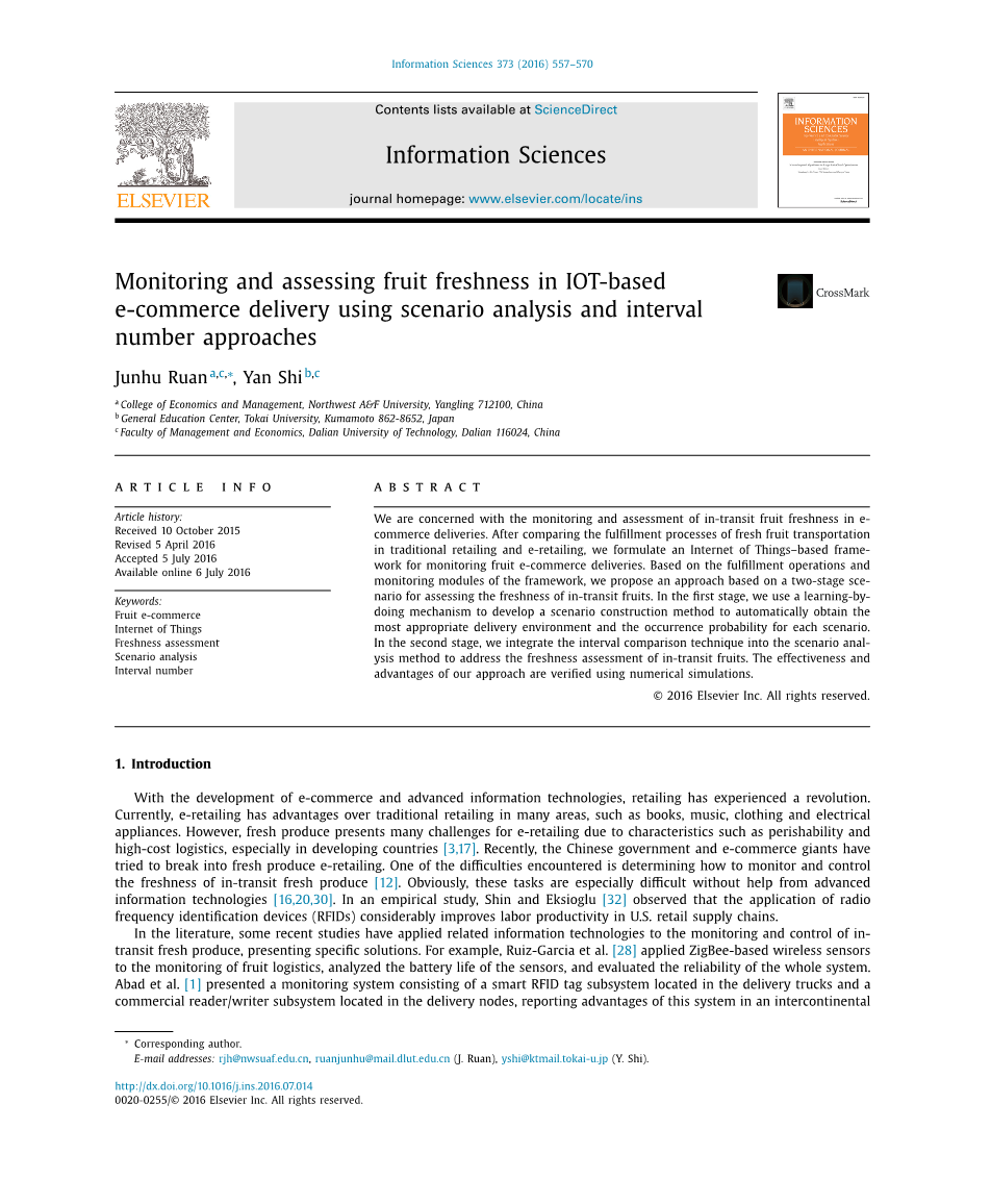 (来源:Ruan, Junhu,Shi, Yan.Monitoring and assessing fruit freshness in IOT-based e-commerce delivery using scenario analysis and interval number approaches[J].Information Sciences: An International Journal,2016,373:557-570.)