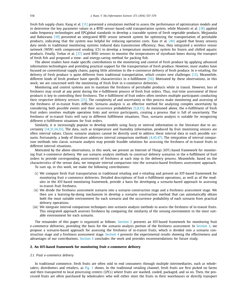 本文的其余部分组织如下。第二部分提出了一个基于物联网的框架,用于监控水果的电子商务交付,为新鲜度评估的情景分析部分提供了基础。在第三部分中,我们提出了一种基于情景的方法来评估中转水果的新鲜度,这种方法分为情景构建阶段和新鲜度评估阶段。第四部分介绍了实验结果,显示了我们的贡献的有效性和优势。第5部分总结了工作,并为未来的研究提供了建议。