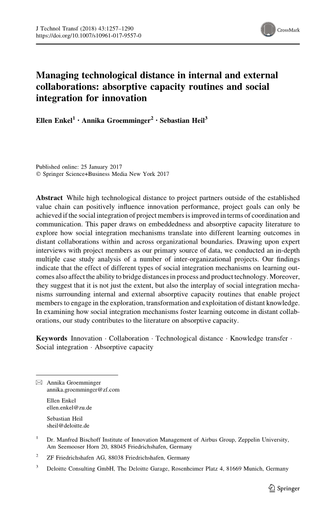 (选自Ellen Enkel,Annika Groemminger,Sebastian Heil.Managing technological distance in internal and external collaborations:absorptive capacity routines and social integration for innovation[J]. The Journal of Technology Transfer.2018,43(5):1257~1290.)