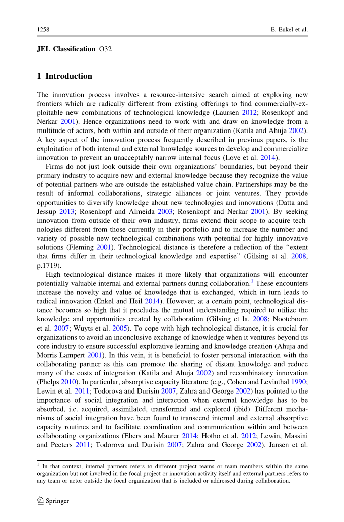高技术距离使得组织在协作过程中更有可能遇到潜在的有价值的内部和外部合作伙伴[1]。这些相遇增加了交流的知识的新颖性和价值,进而导致激进的创新(Enkel和Heil,2014)。然而,在某一点上,技术距离变得如此之高,以至于它排除了利用合作创造的知识和机会所需的相互理解(Gilsing等,2008;Nooteboom等,2007;Wuyts等,2005)。为了应对高技术距离,当组织在其核心产业之外冒险以确保成功的探索性学习和知识创造时,避免不确定的知识交流是至关重要的(Ahuja和Morris Lampert,2001)。在这种情况下,促进与合作伙伴的个人互动是有益的,因为这可以促进远程知识的共享,降低整合(Katila和Ahuja,2002)和重组创新(Phelps,2010)的许多成本。尤其是吸收能力文献(Cohen和Levinthal,1990;Lewin等,2011;Todorova和Durisin,2007;Zahra和George,2002)指出了当必须吸收外部知识时,社会融合和互动的重要性,即获得、同化、转化和探索(同上)。已经发现不同的社会融合机制超越了内部和外部吸收能力的常规,促进了合作组织内部和之间的协调和沟通(Ebers和Maurer,2014;Hotho等,2012;Lewin,Massini和Peeters,2011;Todorova和Durisin,2007;Zahra和George,2002)。Jansen等(2005)经验表明,吸收能力通过社会融合机制得到加强,如与不同层级的内部知识来源的联系以及组织中个人的社会化策略。同时,Ebers和Maurer(2014)展示了组织边界管理者的外部和内部联系如何分别影响组织的潜力和实现的吸收能力。这与强调一个组织与外部知识来源的联系如何在获取和利用外部知识方面提供好处的其他文献是一致的(Cockburn和Henderson,1998;Zucker等,1994;Zucker等,2002,1998)和创新绩效((Owen-Smith和Powell,2004;Powell等,1996)。此外,文献指出了社会接近伙伴在组织通过互动学习和创新能力中的作用(Granovetter,1985;Uzzi,1997)。因此,强大的社会联系有助于整合难以转移的知识。此外,对于与高技术或认知距离的合作伙伴的合作尤为重要(Nooteboom等,2007),即当涉及到协调和交流私有和专有知识时,远程协作、强大的联系和嵌入性被认为提供了替代解决方案。更具体地说,这种协调和交流专有知识的替代方式可以提高团队生产率,促进探索性学习((Reagans和McEvily,2003;Uzzi和Lancaster,2003)。