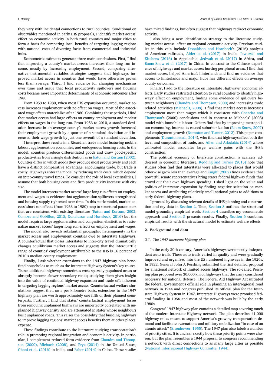 计量经济预测产生3个主要结论。首先,我觉得这提高了一个县的市场进入增加了他们的长期运行IN-来,主要是通过增加就业机会。其次,比较落后原生工具变量的策略建议是公路证明了市场进入的县那将有 否则生长少比平均。第三,我找到证据的改变机制在时间和认为是当地生产力的溢出效应和住房成本变得更加重要因素的经济成果后,1980年。