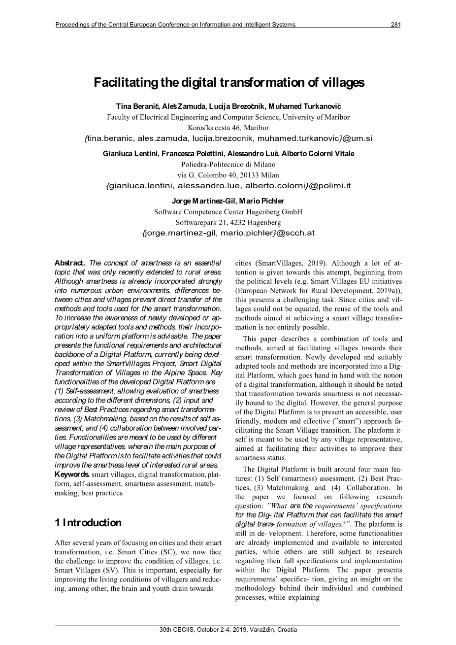 智能转型的主要推动因素之一是存在适当的数字支持。在智能村庄项目的背景下,开发数字平台是支持目标农村地区创新的技术组成部分。为了实现这一目标,必须处理不同的方面,并支持选定的专门功能。