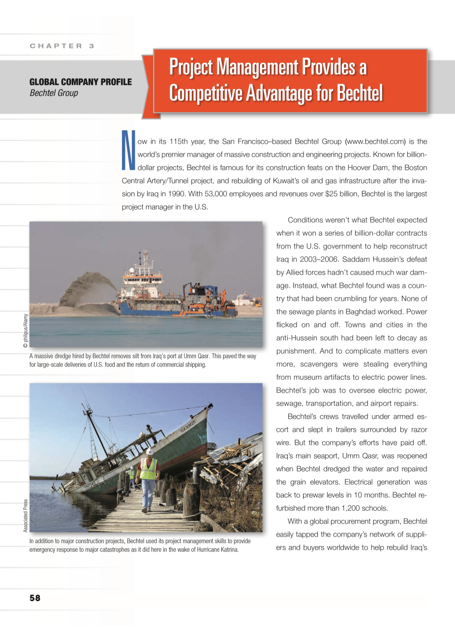 2003-2006年,Bechtel从美国政府获得一系列帮助重建伊拉克的10亿美元的合同时,情况并不如愿。萨达姆·侯赛因被盟军打败并没有造成太多的战争。相反,Bechtel发现的是一个已经濒临破产的公司。巴格达的污水处理厂都没有工作;电源闪烁开机和关闭;侯赛因南部的城镇被留下腐烂作为惩罚。使事情更加复杂的是,拾荒者窃取了从博物馆文物到电线的一切。Bechtel 的工作是监督电力、污水、交通和机场维修。