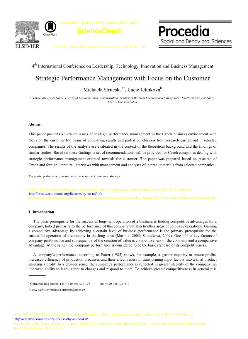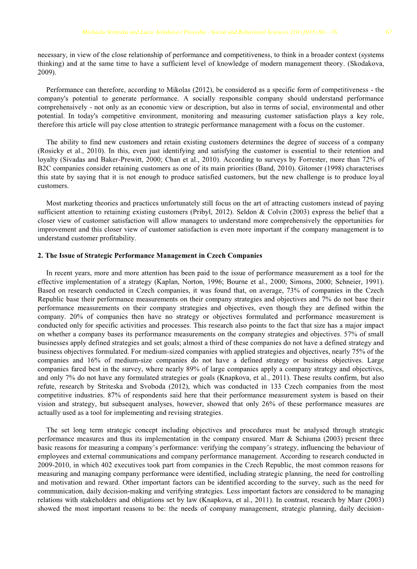 因此,根据Mikolas(2012),绩效可以被认为是一种特定的竞争形式——公司产生绩效的潜力。一个有社会责任感的公司应该全面理解绩效——不仅要从经济角度或描述绩效,还要从社会、环境和其他潜力方面来理解。在当今竞争激烈的环境下,客户满意度的监测和测量起着至关重要的作用,因此本文将以客户为中心,关注战略绩效管理。