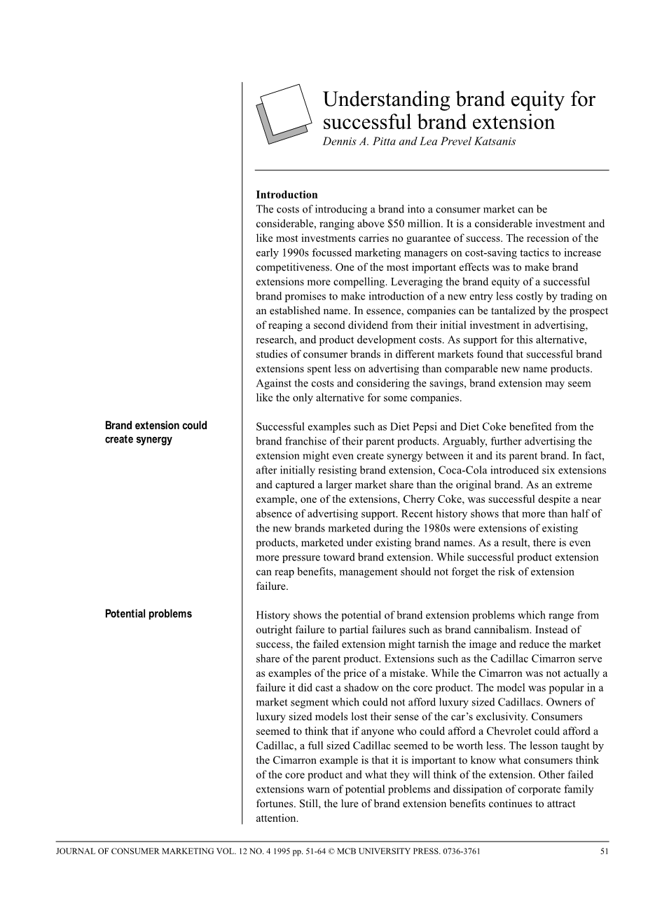 引言:将品牌引入消费者市场的成本相当可观,高达5000万美元以上。这是一个相当大的投资,像大多数投资一样不会保证成功。20世纪90年代初的经济衰退集中在营销经理的节约成本的手段上,以提高竞争力。其中最重要的影响是品牌扩展更引人注目。利用成功品牌的品牌资产,承诺通过以既定的名义进行交易,使新进入的成本降低。实质上,公司可以从其在广告,研究和产品开发成本方面的初始投资中获得第二个分红的前景而引人注目。作为对这种替代方案的支持,对不同市场的消费品牌的研究发现,与可比较的新产品相比,成功的品牌扩展在广告上的花费较少。反对成本和考虑到储蓄,品牌延伸似乎是一些公司的唯一选择。