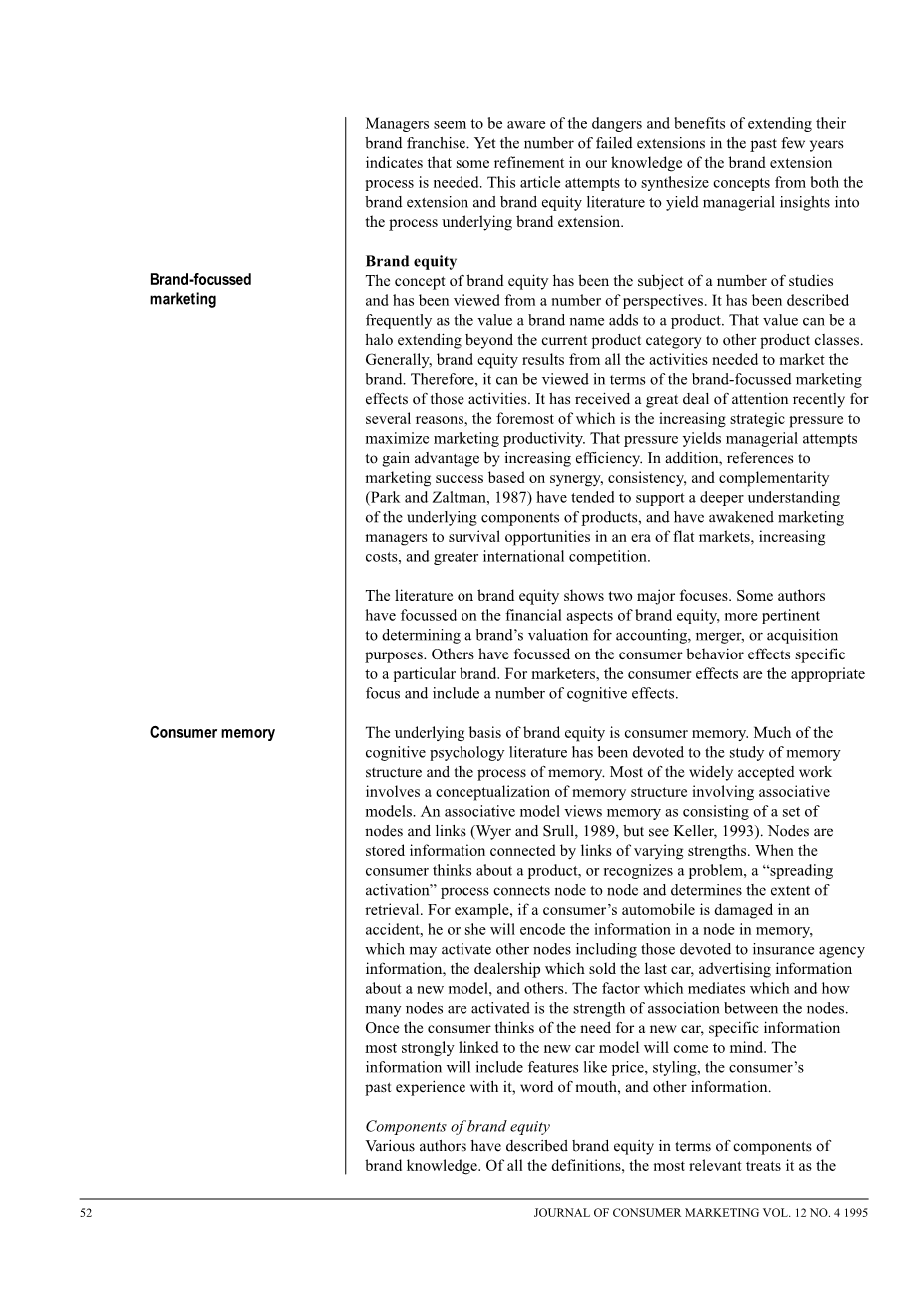 品牌资产潜在的基础是消费者记忆。大部分的认知心理学文献用于记忆结构和过程的记忆的研究。最广泛接受的大部分研究成果包括建立理论化的记忆结构涉及联想模型。一个联合模型把记忆看作包含一组节点和连接(Wyer and Srull, 1989, but see Keller, 1993)。节点是存储的信息连接不同优势的链接。当消费者考虑产品或注意到问题时,“扩散激活”过程连接点对点并确定检索的程度。例如,如果顾客的汽车是在一次事故中毁坏了,他或她将编码在一个节点在内存中的信息,那个可能会激活其他包括那些投入身心保险代理信息的节点,那个售出了最后一辆车的经销商,一个新模型的广告信息及其它。那个调解的因素是哪个和多少节点是被联合节点间激活。一旦消费者认为需要一辆新车,联系到新车型的最强烈的具体信息会来到脑海中。这些信息将包含产品特点像价格、款式、消费者过去对它的经验、口头宣传和其他信息。
