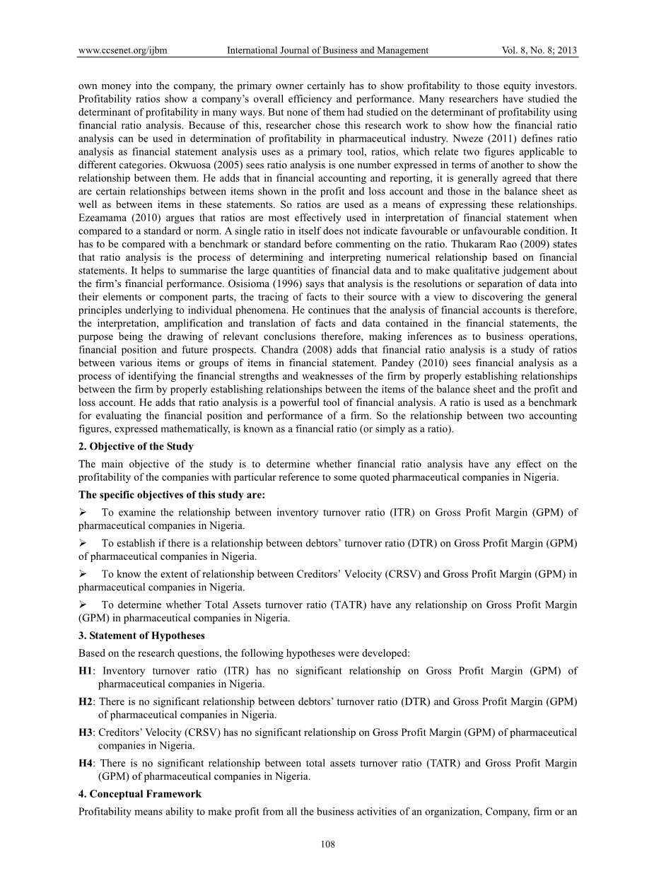这项研究的主要目的是确定财务比率分析是否有任何影响特别是在尼日利亚的一些报价制药公司的利润率。