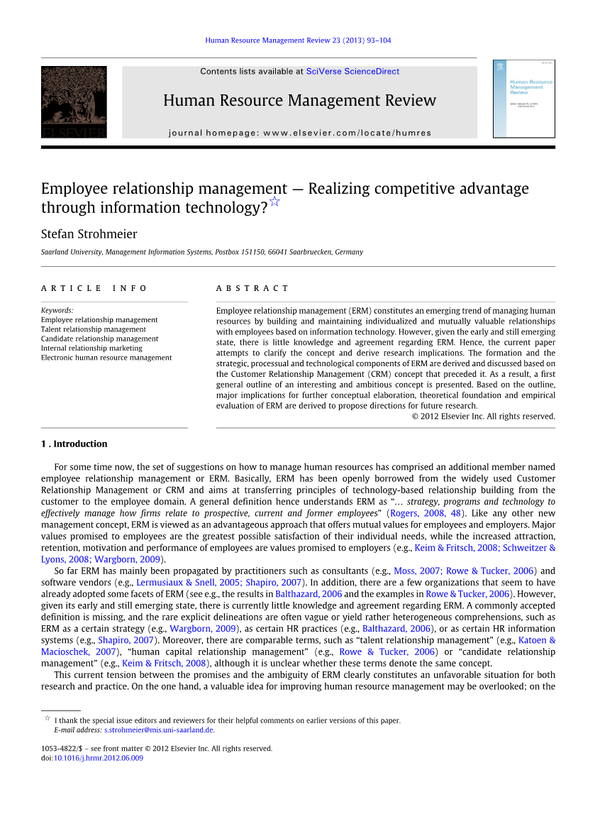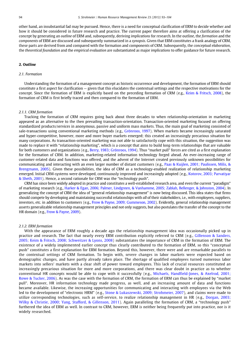 大约十年前,随着erm的出现,erm的形成,关系管理理念偶尔也会在实践和研究中被采纳。事实上,几乎所有的erm贡献都明确提到了crm(例如,吉伦森和桑德斯,2005年;凯姆amp;弗里奇,2008年;施韦策和里昂,2008年),证实了crm在erm形成过程中的重要性。因此,一个广泛实施的早期概念的存在,显然促成了erm的形成,因此,这个“概念推动”构成了erm形成的第一个解释。然而,在此之外,过去和现在都与crm形成的背景环境有显著的相似之处。首先,劳动力市场的严重变化是基于人口结构的变化,并且已经部分发生了。由于缺乏合格的雇员,许多劳动力市场变成了卖方市场,权力明显转向了雇员。对越来越多的公司来说,这种缺乏关键资源的情况越来越不稳定,在实践中,人们显然怀疑传统的人力资源概念是否能够成功地应对这一问题(例如,麦克尔斯、Handfield-Jones和阿克塞尔罗德,2001年);罗和塔克,2006年)。与crm的形成一样,erm的形成因此可以用“市场拉动”来解释。此外,人力资源信息技术也取得了进展,越来越多的数据和功能可用。同样,通过网络与雇员交流和互动的机会越来越多,导致了'电子人力资源'的发展(例如,斯通和Lukaszewski,2009年;strohmeier,2007年),并声称利用了相应的技术,如自助服务,实现人力资源的关系管理(例如,多尔根,2003年;威尔基与克里斯蒂,2000年;杨,斯塔福德,吉伦森,2011年)。随着crm的形成,“技术推动”也推动了erm的概念。然而,与crm相比,erm既没有被频繁地付诸实践,也没有得到广泛的研究。