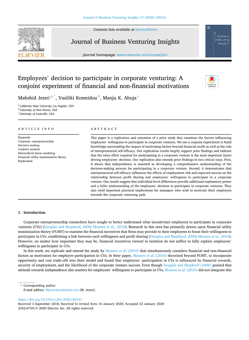 在这项工作中,我们模仿并扩展了Monsen等人的研究,他们同时将财务和非财务因素视为员工参与企业创业的动机。在他们的论文中,Monsen等人从FUMT出发进行理论分析,将机会和成本权衡纳入其研究模型,并发现员工参与企业创业会受到财务奖励,就业保障和企业成功的可能性的影响。尽管Douglas and Shepherd认为独立性的态度对员工参加简历的意愿也很重要。但是Monsen等没有在这个概念模型中包括这个因素。此外,Bird(1988)和Krueger等人(2000)提出自我效能感是创业意向的主要决定因素,这表明自我效能感应被引入到试图理解员工如何决定是否参加简历的模型中。我们复制了Monsen等人的研究,并将其扩展为企业家自我效能感(ESE)作为讨论员工在决定是否参加企业创业时需要做出的权衡的个人因素。