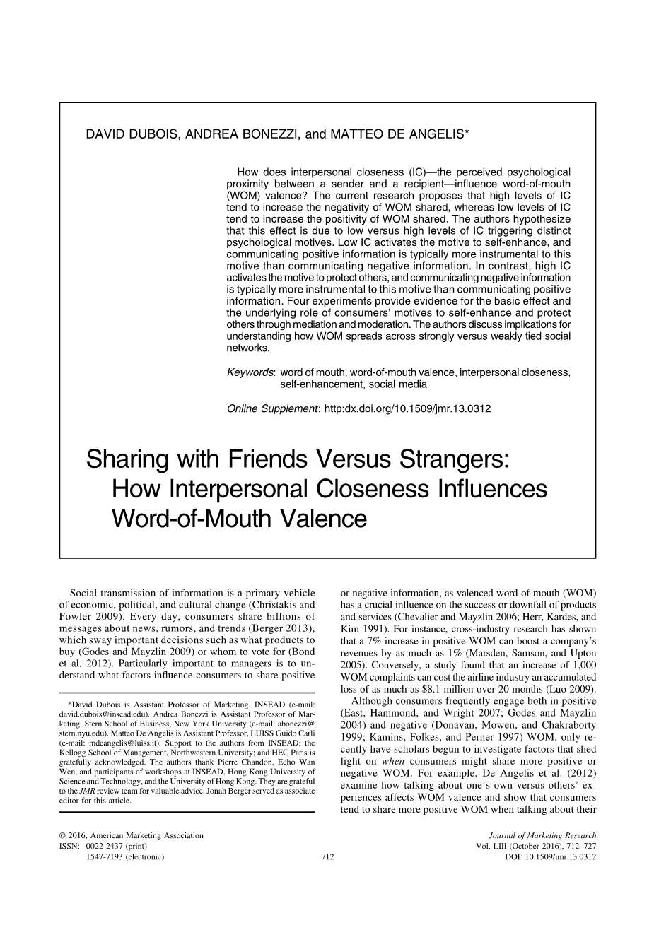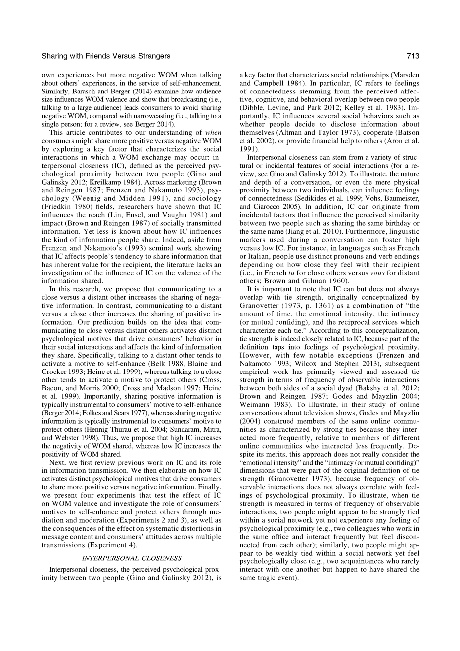 这篇文章有助于我们了解什么时候消费者可以分享更多的积极和消极的口碑,通过探索一个关键因素,表征了社会互动中口碑交换可能发生:人际亲密(IC),定义为两个人之间的感知心理接近(基诺和加林斯基2012;克里尔坎普1984)。在市场营销(Brown and Reingen 1987;Frenzen and Nakamoto 1993)、心理学(Weenig and Midden 1991)和社会学(Friedkin 1980)等领域,研究人员已经表明,IC影响社会传播信息的范围(Lin、Ensel和Vaughn 1981)和影响(Brown and Reingen 1987)。然而,人们对人际亲密度如何影响人们共享的信息种类知之甚少。事实上,除了Frenzen和Nakamoto(1993)的开创性著作表明IC影响人们共享对接受者具有内在价值的信息的倾向之外,文献中还缺乏关于IC对所共享信息的价格的影响的研究。