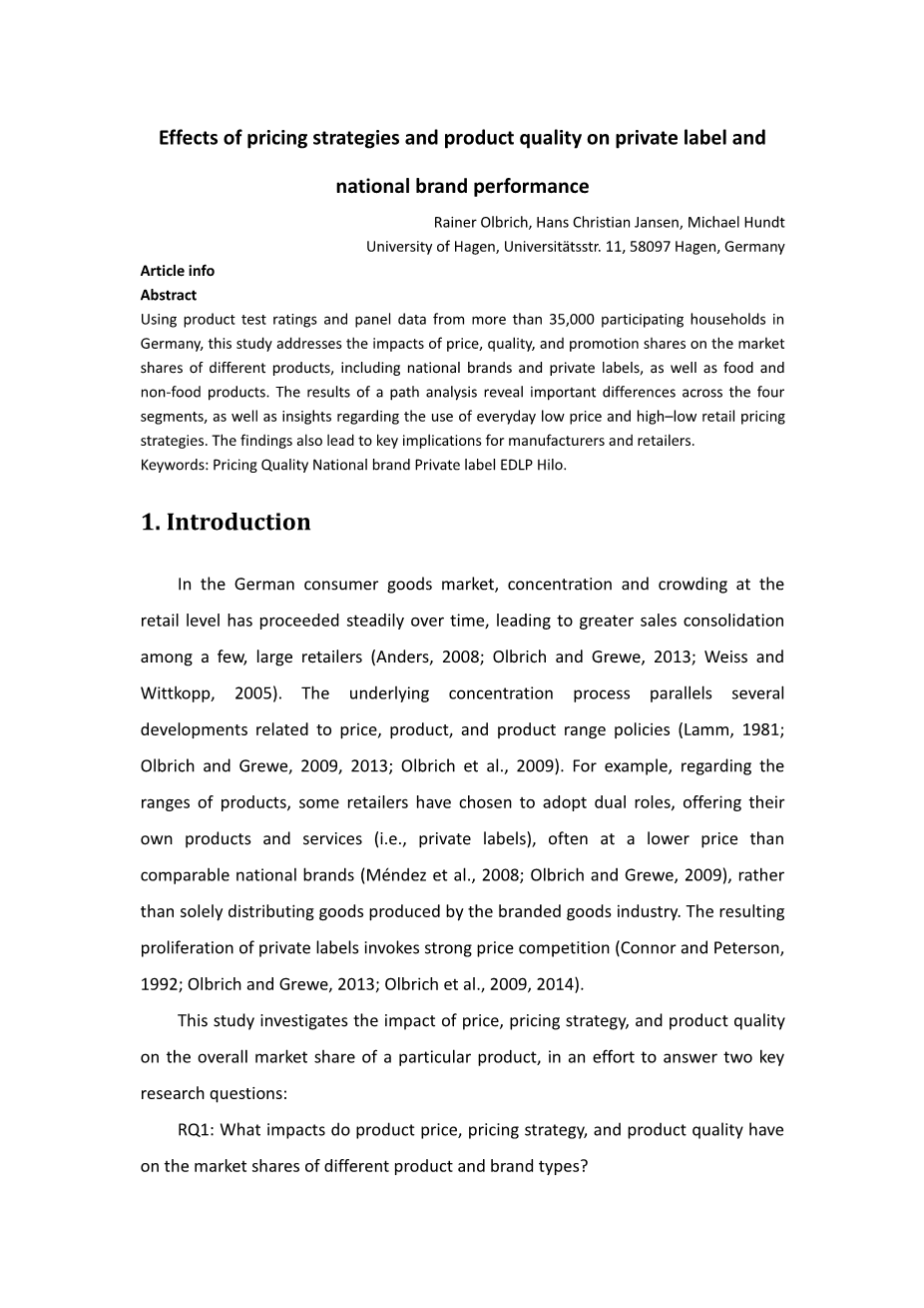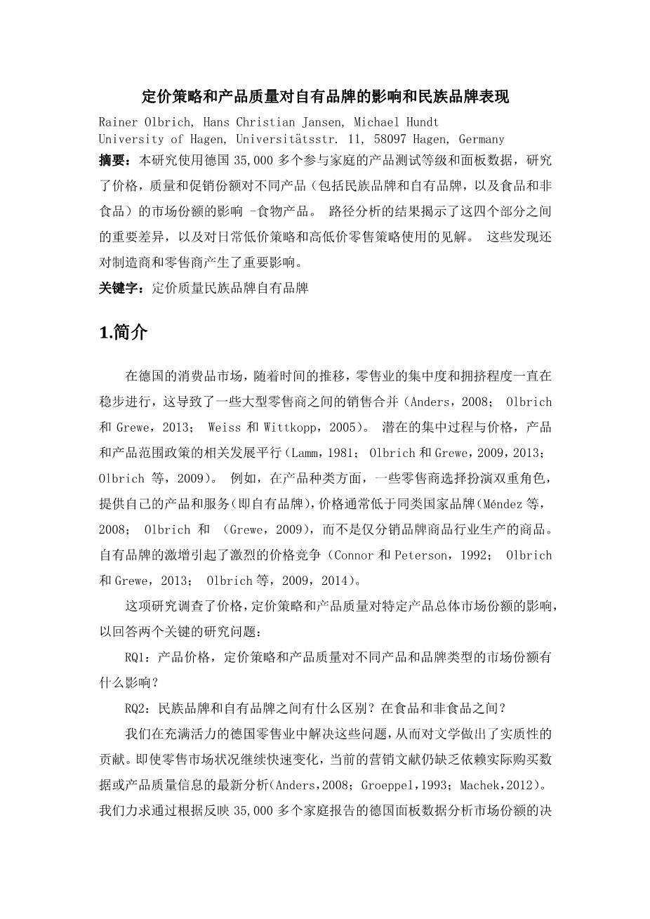 定价策略和产品质量对自有品牌的影响和民族品牌表现外文翻译资料