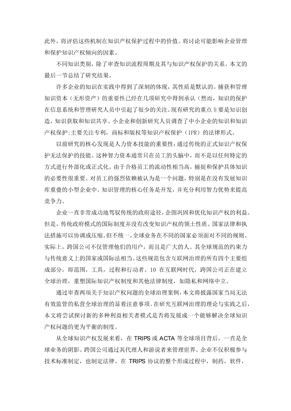Knowledge-based assets, intellectual property, and capital play a fundamental role in an enterprisersquo;s com-petitiveness, especially in small knowledge intensive enterprises. Small knowledge intensive enterprises need to create new ways of operating in order to manage the intellectual and knowledge-based assets in their organizations more efficiently. Organizational knowledge and intellectual property can be protected, either formally via IPR, or informally via efficient knowledge management. Successful IP protection requires systematic intellectual property and knowledge management. Intellectual property protection via efficient knowledge management affects the entire organization rather than being just a separate task. It needs to be embedded in organizational work routines, practices, and processes as an overall operational strategy. When embedded in organizational work processes, IP protection and knowledge management become a continuous part of work routines and tasks in the enterprise, not a separate action.
