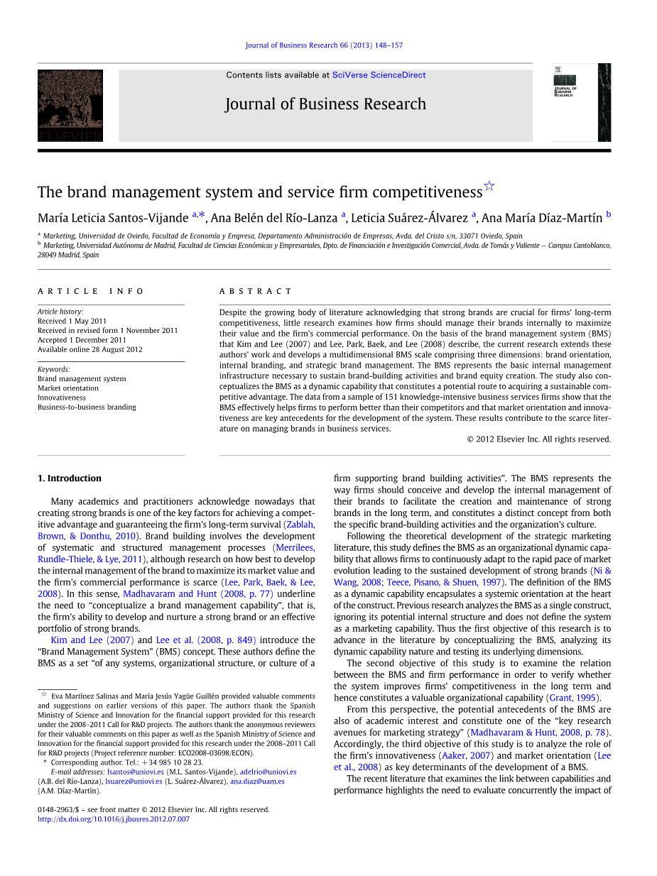 Kim and Lee(2007)和Lee et al.(2008,第849页)介绍了“品牌管理系统”(BMS)的概念。这些作者将BMS定义为“支持品牌建设活动的任何系统、组织结构或企业文化”的集合。BMS代表了企业应该构思和发展品牌的内部管理,以促进强势品牌的长期创建和维护,并构建一个不同于特定品牌建设活动和组织文化的概念。本研究遵循战略营销研究的理论发展,将BMS定义为一种组织动态能力,使企业能够不断适应市场演变的快速步伐,从而形成强大品牌的持续发展(Ni amp; Wang, 2008;Teece, Pisano amp; Shuen, 1997)。BMS作为一种动态能力,它在构造的核心封装了一个系统方向。以往的研究将BMS作为一个单一的结构进行分析,而忽略了其潜在的内部结构,也没有将该系统定义为一种营销能力。因此,本文的第一个目标是通过概念化BMS,分析其动态能力的性质和测试其潜在的维度,在研究取得进展。