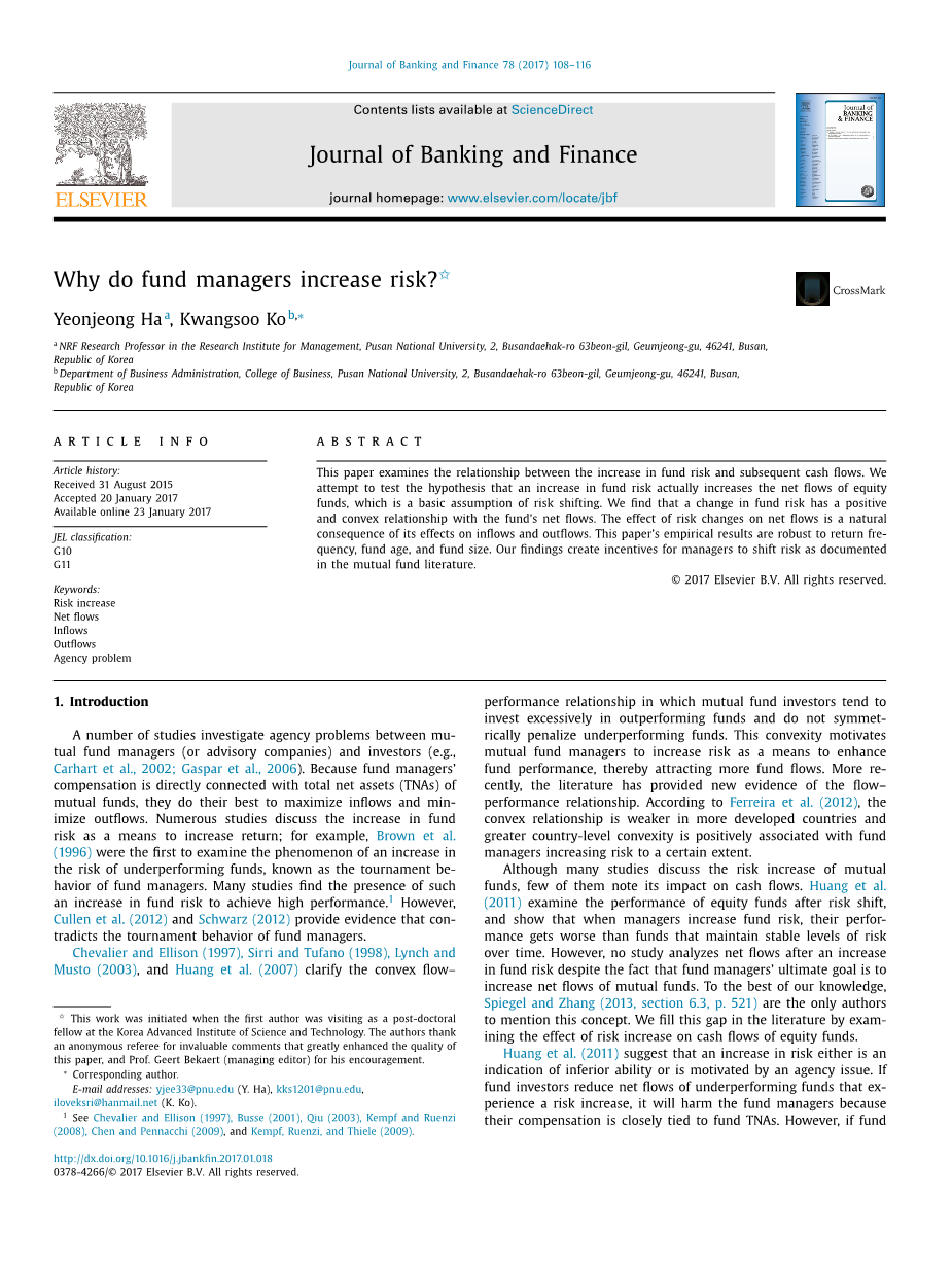 本文研究了基金风险的增加和之后的现金流量。我们尝试去检测基金风险增加实际上增加了基金净流量的假设,这基于风险转移的假设。我们发现基金风险与基金净流量有正相关、凸曲线的关系。风险变化对净流量的影响是对其流入及流出的自然结果。本文的实验结果对基金回报率、基金年龄和基金规模具有较好的稳健性。我们的研究发现为基金管理者转移风险创造了激励机制,在共同基金文献中有证明。